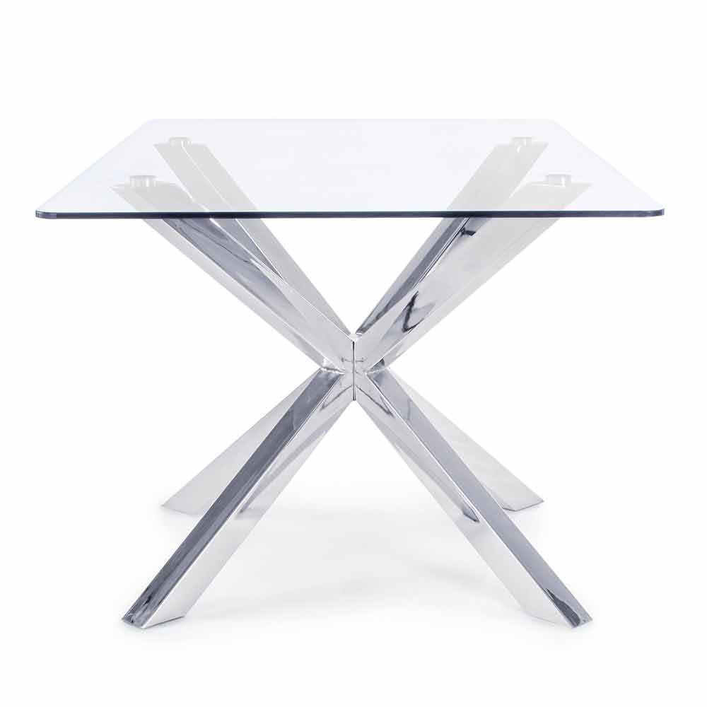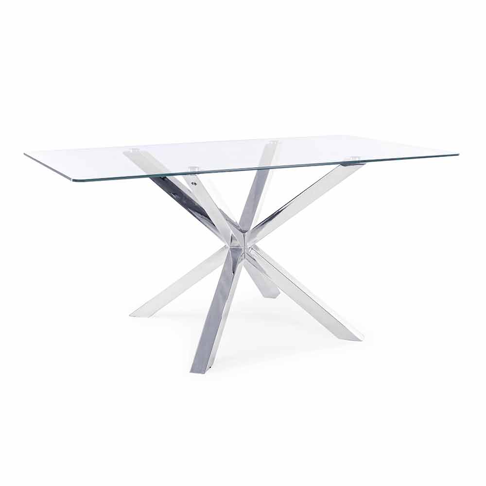 Moderner Esstisch mit gehärteter Glasplatte und Stahlbeinen.