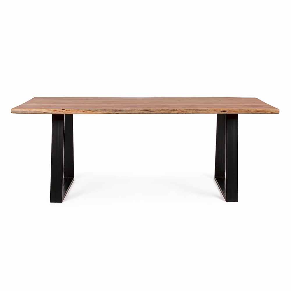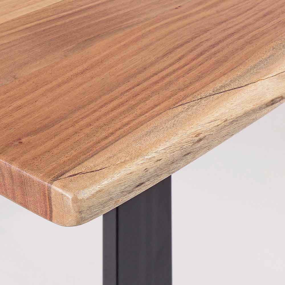 Top aus Akazienholz , Beine aus epoxidpulverbeschichtetem Stahl . Finish auf Basis von Polyurethanfarbe.