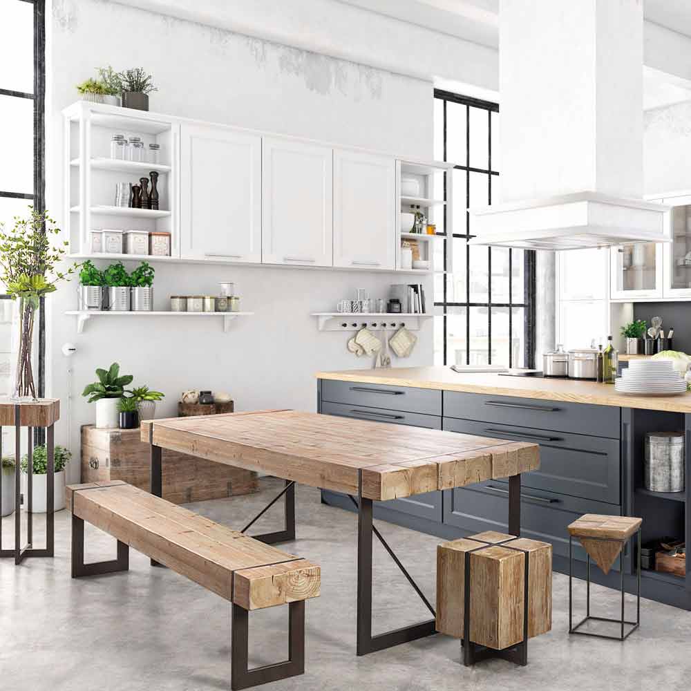 Moderner Esstisch im Industriestil mit Tannenholzplatte.