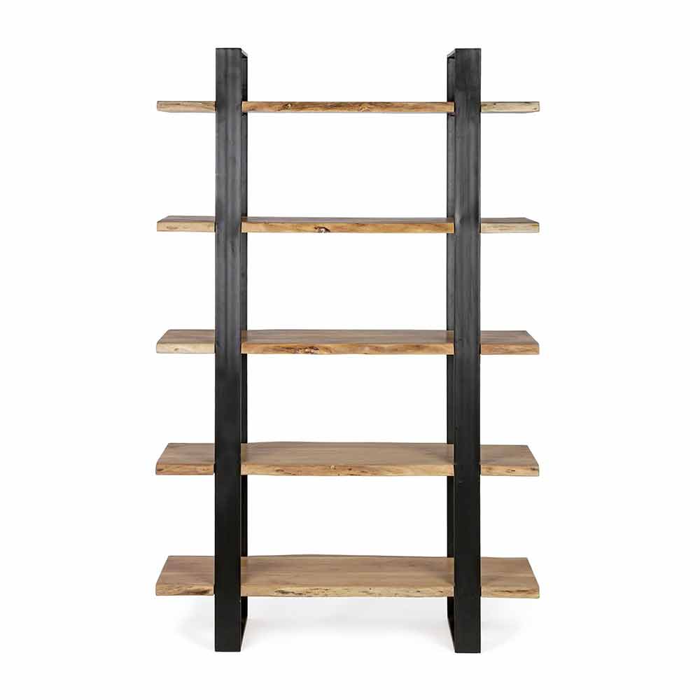 Modernes Design-Bücherregal aus lackiertem Stahl und Akazienholz.