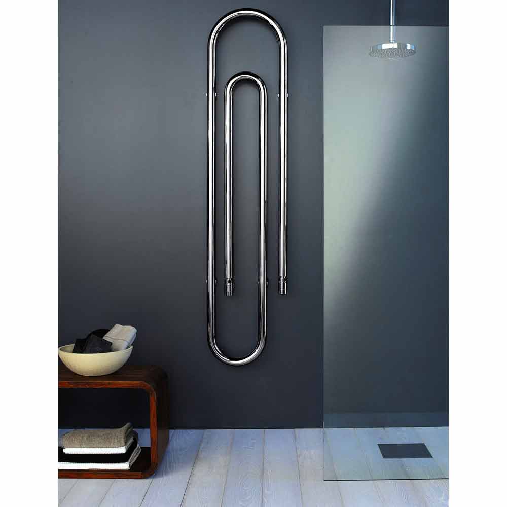 Graffe Design-Hydraulikheizkörper mit Chromoberfläche von Scirocco H Heizkörper in Form einer horizontalen verchromten Büroklammer, in der hydraulischen Version, mit modernem und lustigem Design. Das Thema ist die Erweiterung der Form von Alltagsgegenständen und ihre Funktionsänderung in einem Spiel der sofortigen Wiedererkennung und Annehmlichkeit. Erhältlich in verschiedenen Größen, wählen Sie diejenige, die am besten zu Ihnen passt!