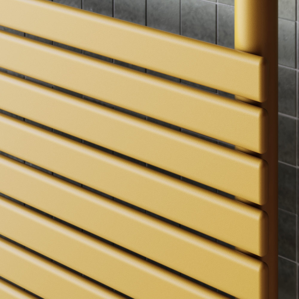 Hydraulischer Heizkörper aus Kohlenstoffstahl in mattiertem Ocker-Finish mit 35 mm flachen Lamellen, komplett in Italien hergestellt.