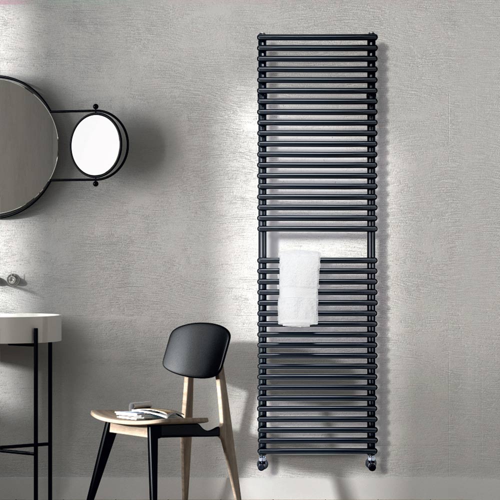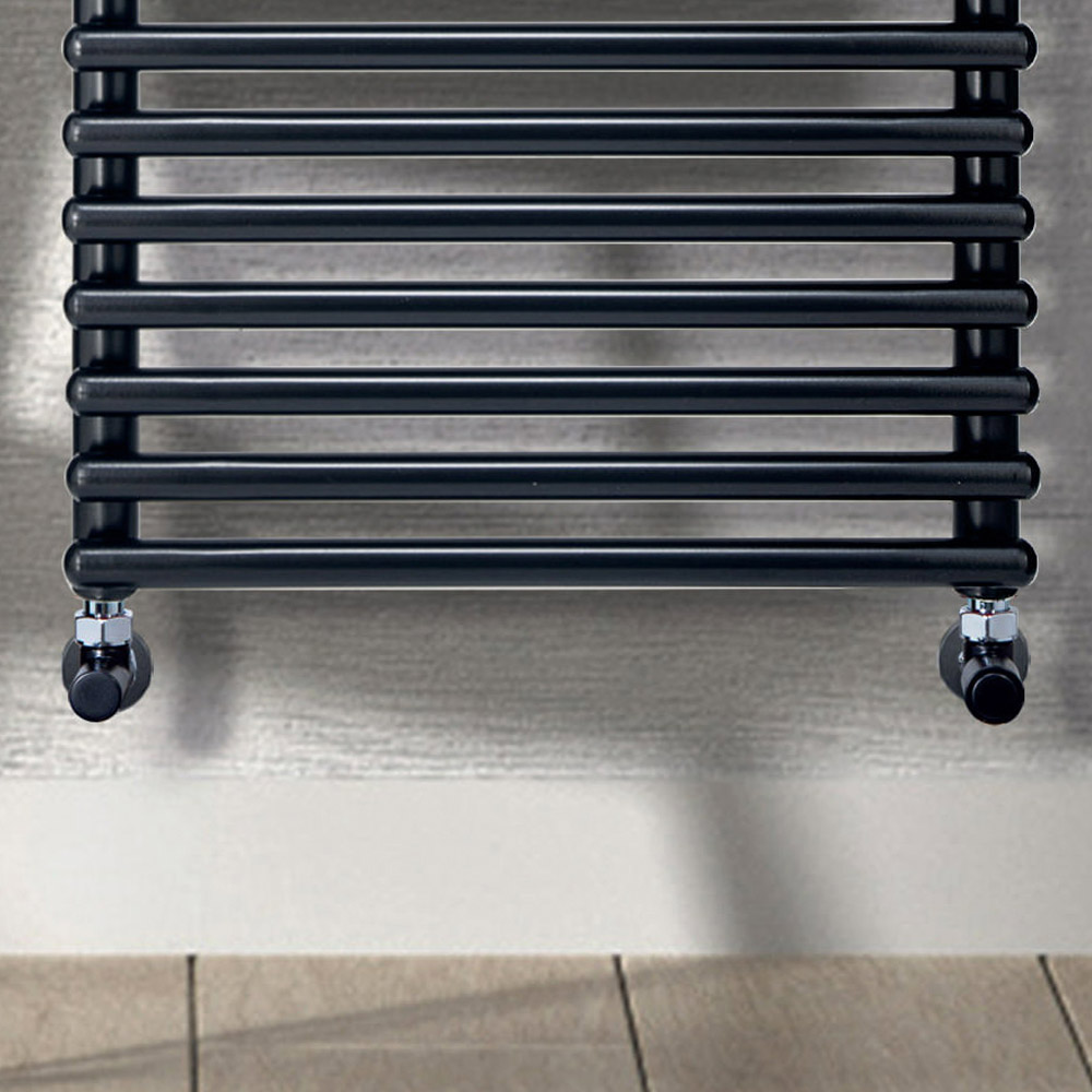 Hydraulischer Handtuchwärmer aus Kohlenstoffstahl mit tiefschwarzer Oberfläche , bestehend aus einer Reihe horizontaler Elemente mit einem Durchmesser von 2,5 cm, die an vertikale Verteiler mit einem Durchmesser von 3,5 cm geschweißt sind. Komplett in Italien hergestellt, inklusive Wandbefestigungsset, Entlüftungsventil und Blindstopfen .