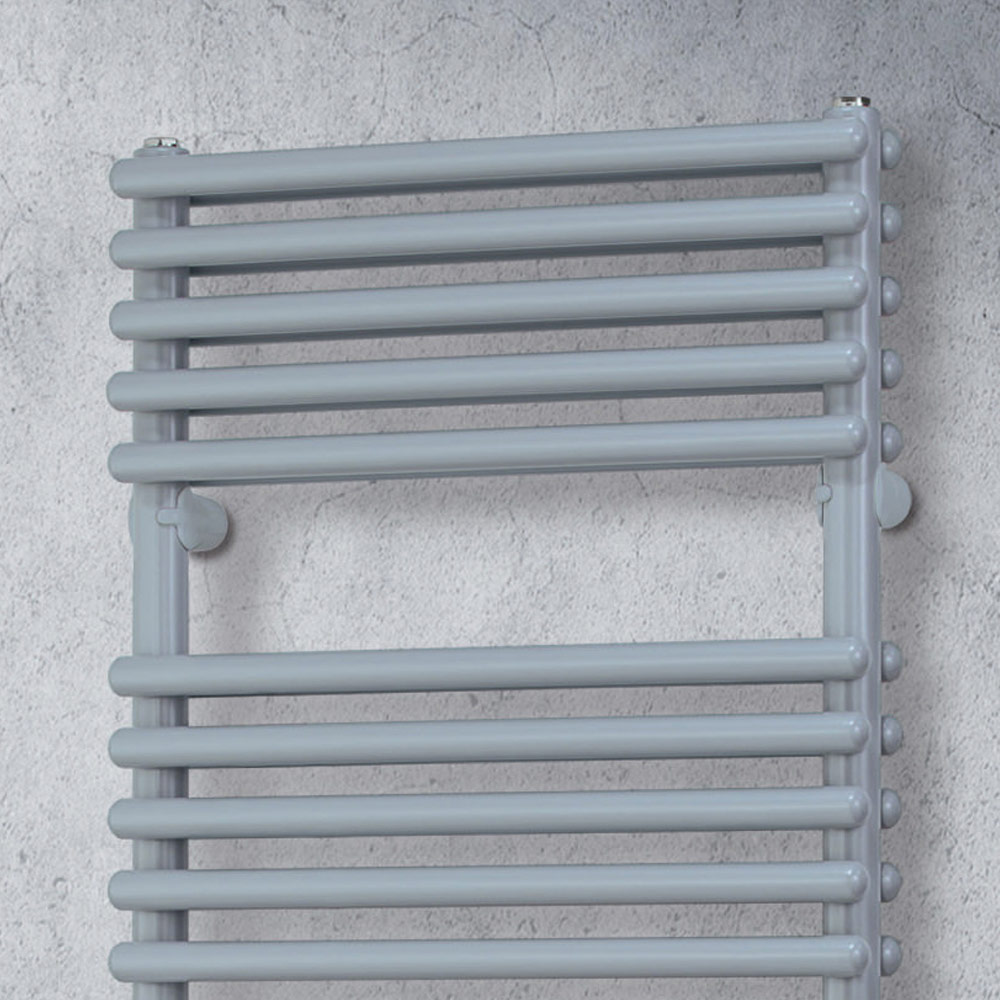 Hydraulischer Handtuchwärmer aus Kohlenstoffstahl mit verkehrsgrauer Oberfläche , bestehend aus einer doppelten Reihe horizontaler Elemente mit einem Durchmesser von 2,5 cm, die an vertikale Verteiler mit einem Durchmesser von 3,5 cm geschweißt sind, vollständig in Italien hergestellt , inklusive Wandbefestigungssatz, Entlüftungsventil und Blindstopfen .