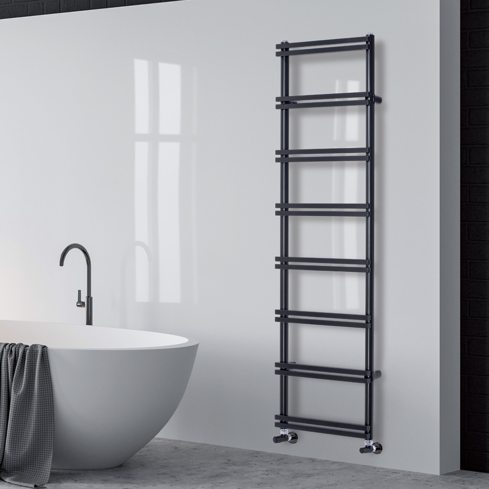 Hydraulischer Handtuchwärmer aus Kohlenstoffstahlmit tiefschwarzer Oberfläche, bestehend aus einer Reihe horizontaler Elemente mit einem quadratischen Querschnitt von 2 cm, die auf vertikale Verteiler mit einem Durchmesser von 3,5 cm geschweißt sind, vollständig in Italien hergestellt,inklusive Wandbefestigungsset, Entlüftungsventil und Blindkappe . Die handwerkliche Fertigung dieses Produkts ist das Markenzeichen der hervorragenden Qualität , die typisch für „Made in Italy“ ist. Dank der hochwertigen Verarbeitung und der verwendeten erstklassigen Materialien erfüllt dieses Produkt die Bedürfnisse und Wünsche eines zunehmend anspruchsvollen Kunden.