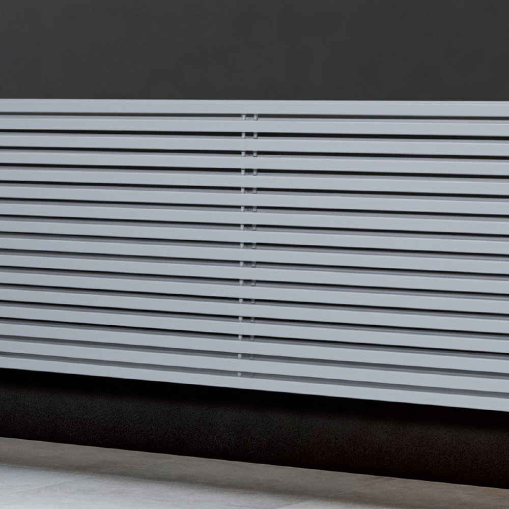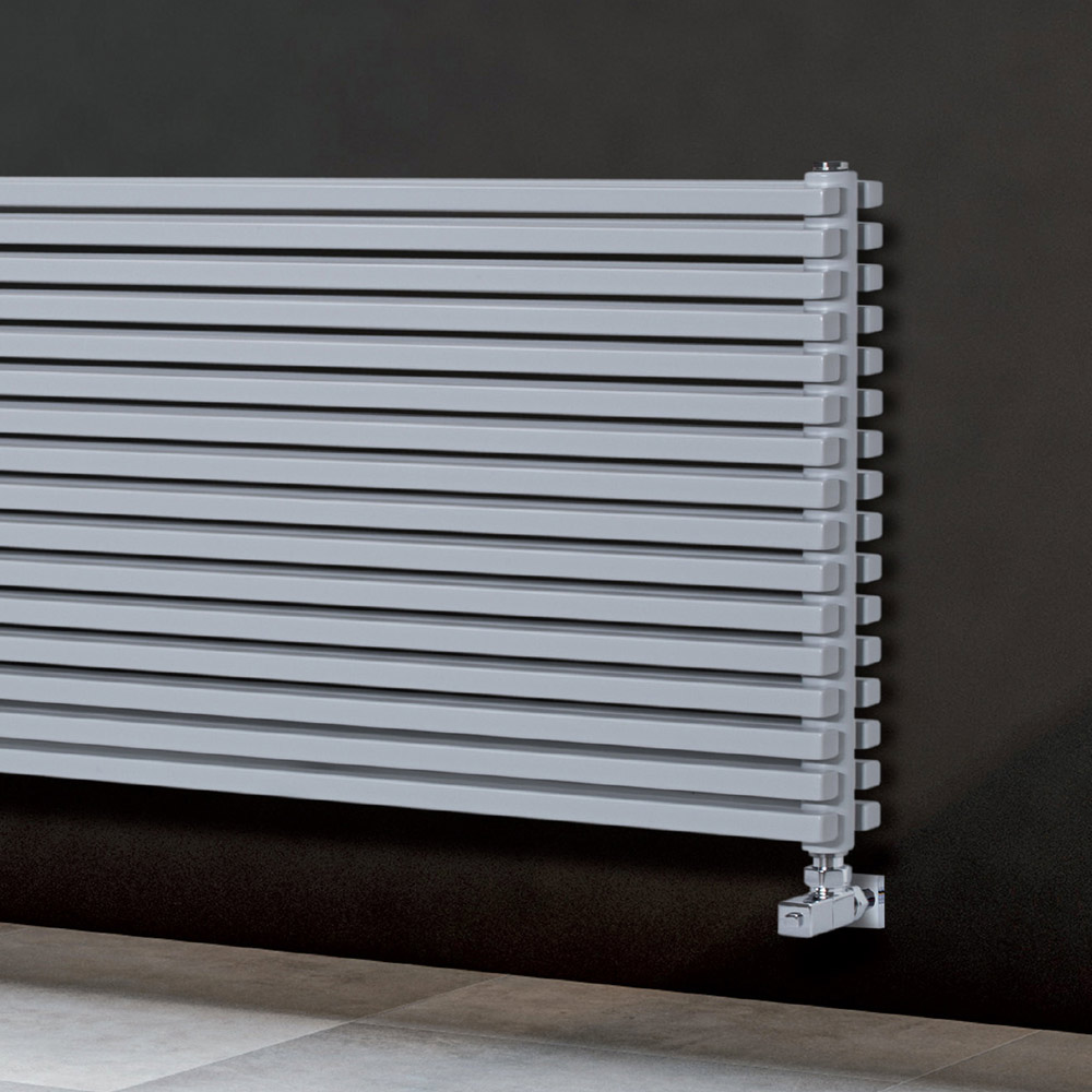 Hydraulischer Heizkörper aus Kohlenstoffstahl mit hellgrauer Oberfläche, bestehend aus einer doppelten Reihe horizontaler Elemente mit einem quadratischen Querschnitt von 2 cm, die an vertikale Verteiler mit einem Durchmesser von 3,5 cm geschweißt sind, vollständig in Italien hergestellt, inklusive Wandbefestigungssatz, Entlüftungsventil und Blindstopfen . Der gesamte Produktionsprozess findet in einer Fabrik in der Nähe von Treviso, nur wenige Kilometer von Venedig entfernt, statt, wo Qualität ein ständiges Ziel ist. Qualität ist gleichbedeutend mit viel Liebe zum Detail und der Auswahl der zuverlässigsten Materialien. So entstehen Heizkörper mit höchster Reinheit in Design und Funktionalität.