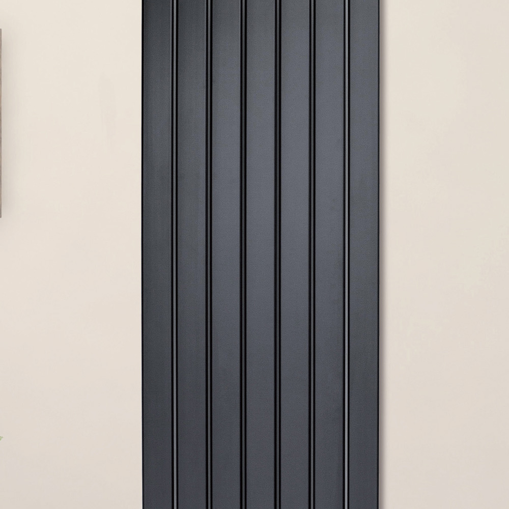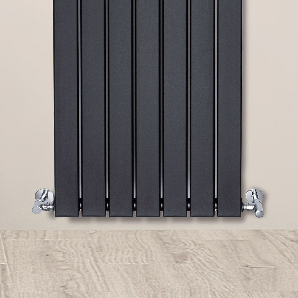Hydraulischer Heizkörper aus Kohlenstoffstahl mit tiefschwarzer Oberfläche, bestehend aus einer Reihe flacher vertikaler Elemente mit den Maßen 7 x 1,1 cm, die an horizontale Verteiler mit einem Durchmesser von 3,5 cm geschweißt sind, vollständig in Italien hergestellt, inklusive Wandbefestigungssatz, Entlüftungsventil und Blindstopfen .