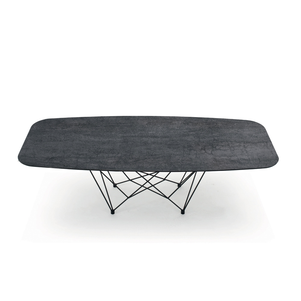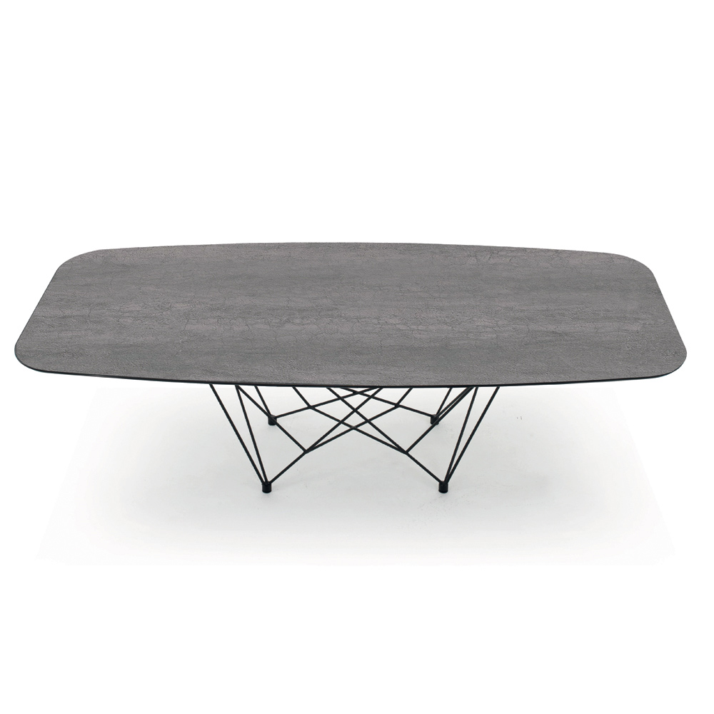 In Italien hergestellter Esstisch mit tonnenförmiger Platte aus Laminatkeramik und Untergestell aus schwarz lackiertem Stahl . Aus der perfekten Kombination von Funktionalität und Design entsteht ein Einrichtungsaccessoire mit einer raffinierten Seele, das Esszimmer oder Küchen auf exklusive Weise mit einem modernen Stil vervollständigt und ihm einen revolutionären Touch verleiht. Die Ästhetik des Tisches wird auch durch die besondere Form des Untergestells bereichert, die dem Erscheinungsbild des Produkts ein originelles Detail verleiht und einer exklusiven Einrichtungslösung mit einer starken zeitgenössischen Persönlichkeit Leben einhaucht. Laminam vervollständigt nicht nur das Aussehen des Tisches mit Eleganz, sondern ist auch ein Material, das zahlreiche Besonderheiten aufweist, die es zur idealen Wahl machen, um gleichzeitig eine solide Auflagefläche und ein edles Design zu bieten, das jede Umgebung mit Persönlichkeit revolutionieren kann.