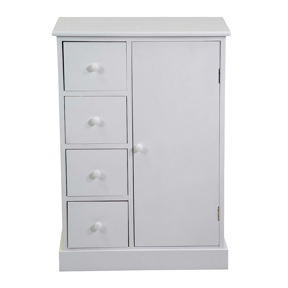 Dieser weiße Schrank ist das Sinnbild für elegante Schlichtheit und zeitlose Funktionalität. Mit 4 seitlichen Schubladen und einer Tür bietet er eine große Aufbewahrungslösung, die sich perfekt für die Aufbewahrung von Alltagsgegenständen, Utensilien, Textilien oder Dokumenten eignet und alles aufgeräumt und außer Sichtweite hält. Die klaren Linien und das minimale Design machen ihn extrem vielseitig : perfekt für Wohnzimmer, Schlafzimmer, Badezimmer oder Eingangsbereiche.
