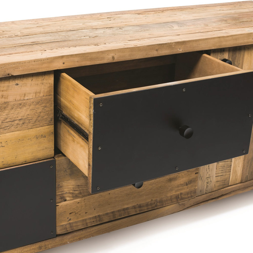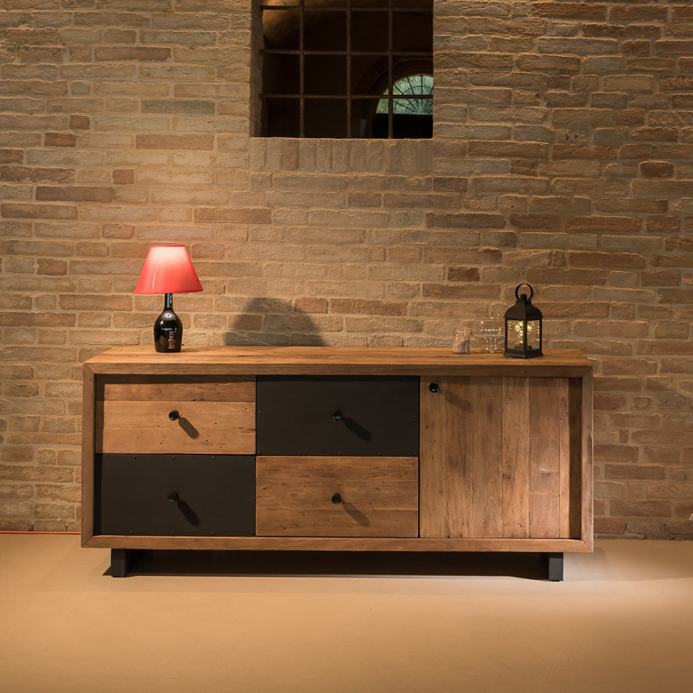 Innen-Sideboard aus natürlichem, kaffeefarbenem Recyclingholz mit 1 Tür, 2 Holzschubladen vorne, 2 schwarzen Metallschubladen vorne und Metallfüßen. Dieses Einrichtungsset ist im wahrsten Sinne des Wortes einzigartig , gerade weil es die besondere Geschichte der belebten Materie verkörpert. Die Verarbeitung erfolgt größtenteils nach handwerklichen Verfahren . Jeder Kratzer und jede Unvollkommenheit, jede Narbe im Holz zeugt von der Ursprünglichkeit einer Vergangenheit, die zu neuem Leben erwacht. Das legal aus alten Artefakten, Booten und verlassenen Gebäuden recycelte Tropenholz wird fachmännisch behandelt und gebürstet, um seine Würde und seinen Glanz wiederzugewinnen. Dieses Produkt vereint die Essenz des rustikalen Geschmacks mit den Formen des zeitgenössischen Designs und mit einigen Details des Industriestils .