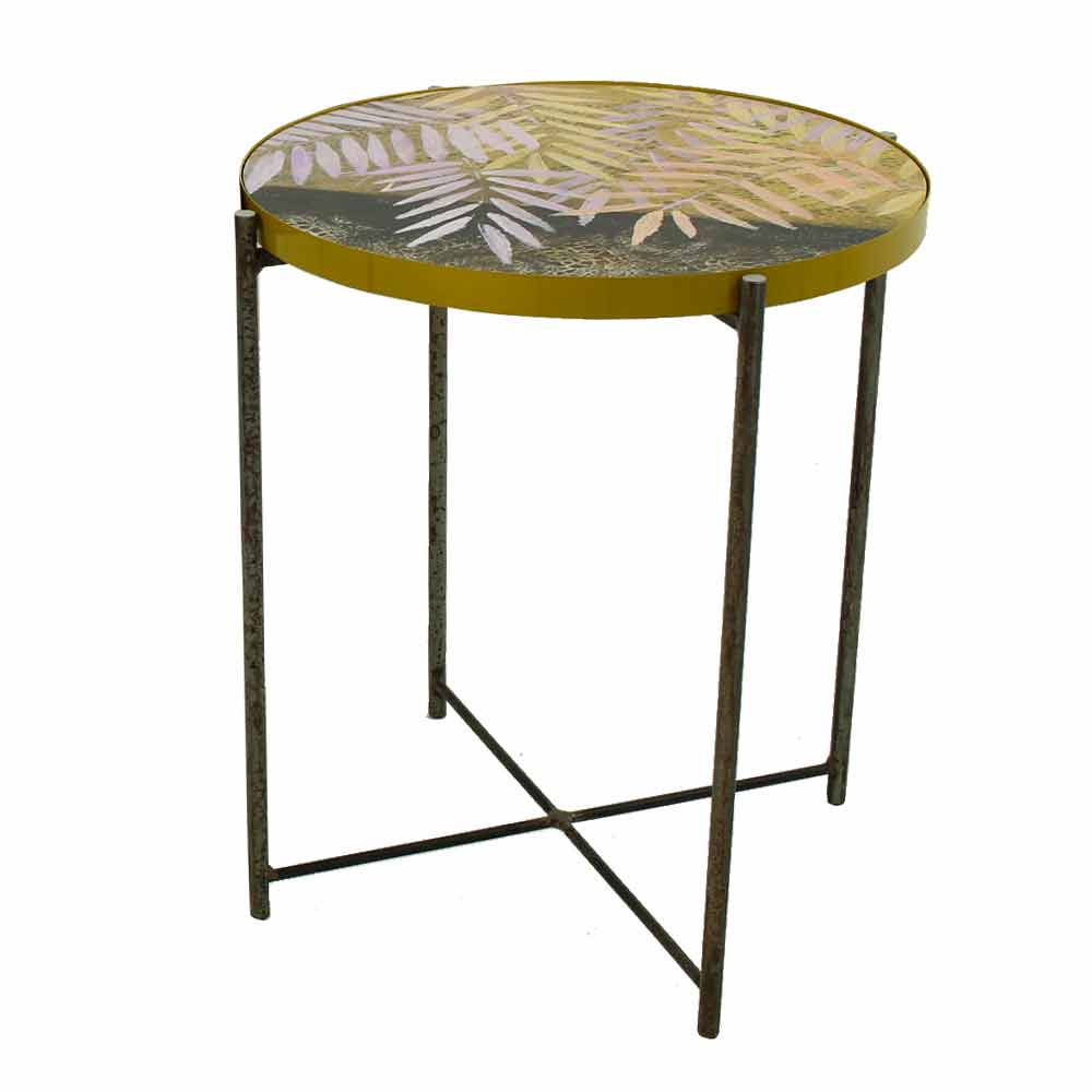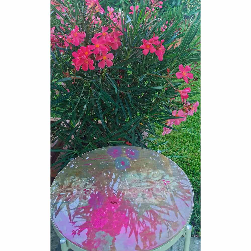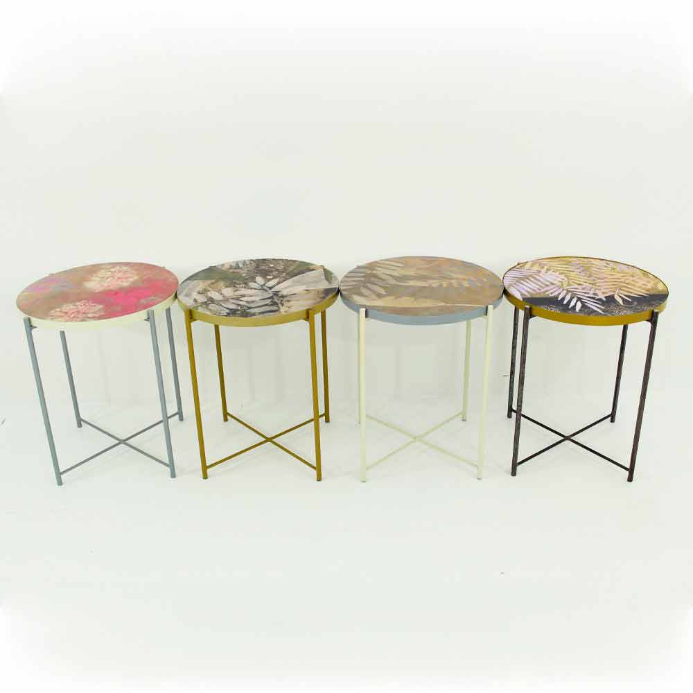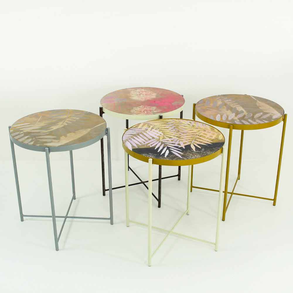 Seine Struktur ist komplett aus pulverbeschichtetem Metall, das für die Verwendung in Innenräumen das Produkt perfekt macht , sondern auch im Freien zu liefern Gärten und Terrassen mit Geschmack und Stil, während die Oberseite von Hand und Harz - Effekt glatt geebnet glänzend verglaster in 6 verschiedenen Ausführungen dekoriert und wird seitlich in eine Metallschale eingeführt und beschichtet. Die Oberseite ist das, was diesen Artikel auszeichnet, da er die Möglichkeit hat, extrahiert zu werden, um so einfach mit den anderen verfügbaren Oberteilen ausgetauscht zu werden, dass dank einer einzigen Basis mehr unterschiedliche Tabellen erhalten werden können.