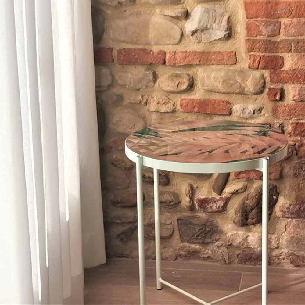 Couchtisch für drinnen oder draußen mit Metallboden und Platte dekoriert und harzbeschichtet Made in Italy.