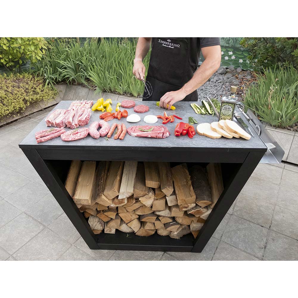 Die Arbeitsplatte aus Feinsteinzeug ist 90 cm hoch und bietet Ihnen zusätzlichen Platz, um Fleisch und Gemüse für Ihre Küche oder Ihren Grill vorzubereiten.