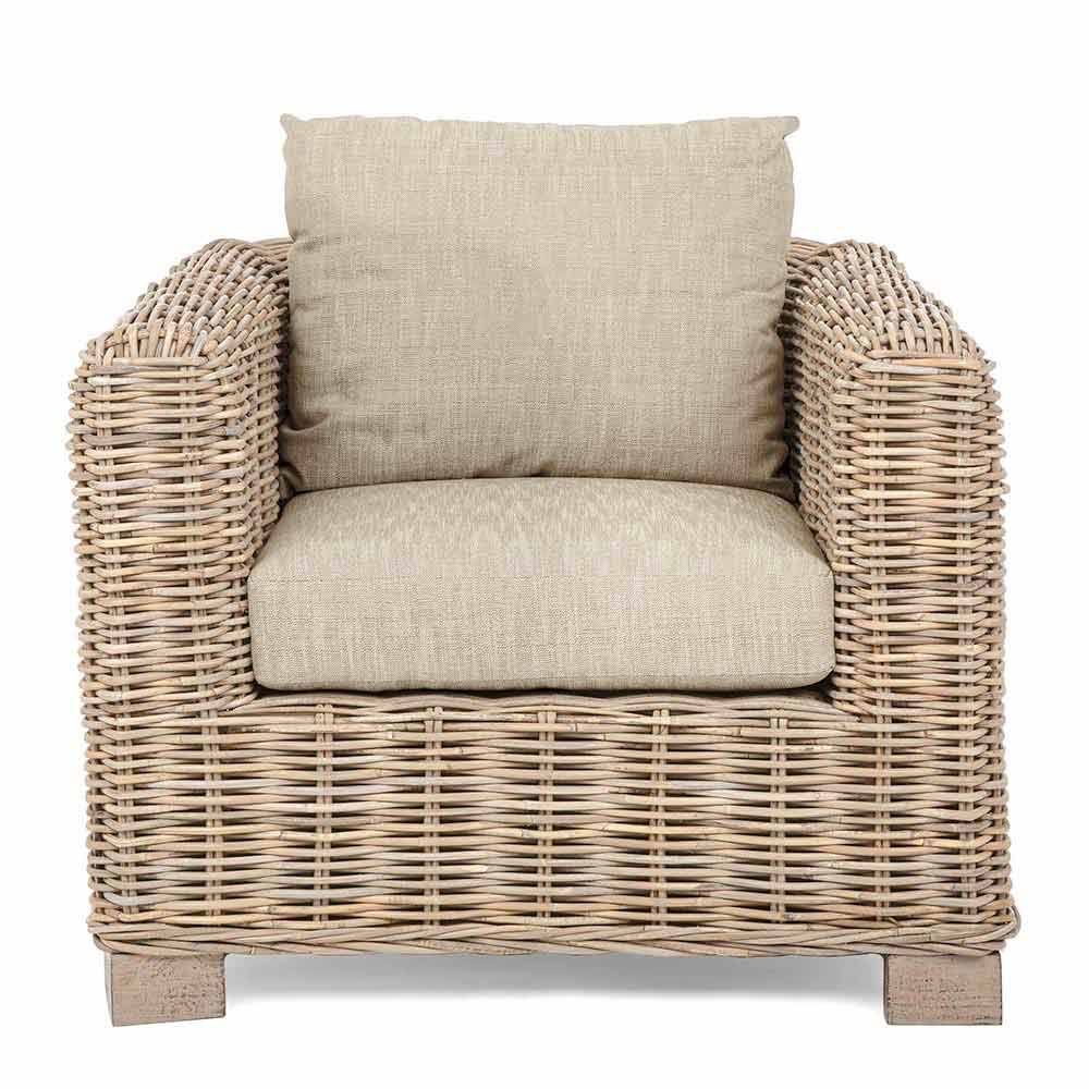 Mangoholz- und Rattanstruktur, Kubu-Webart, natürliches Nitrocellulose-Finish. Kissen mit abnehmbaren Bezügen für den Innenbereich (55% Baumwolle, 45% Polyester).