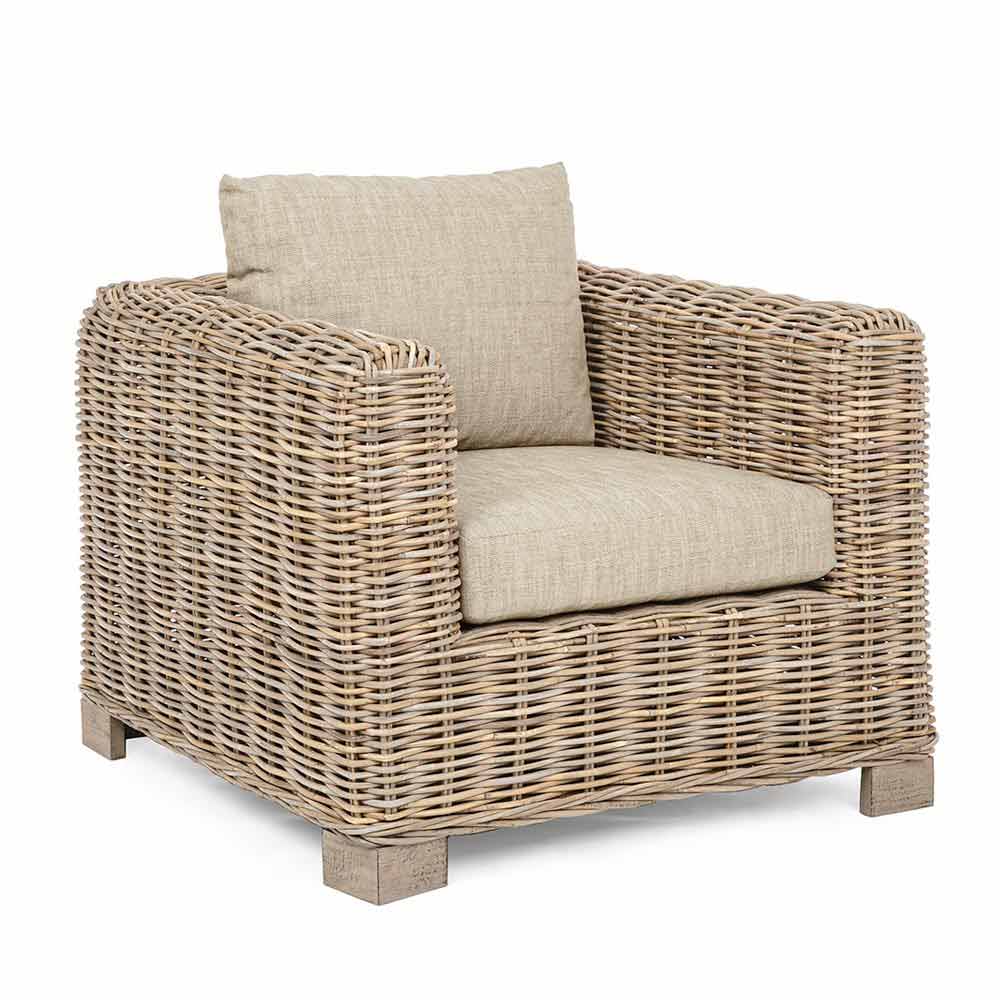 Sessel im ethnischen Stil für den Innen- und Außenbereich aus Rattan und Mangoholz.