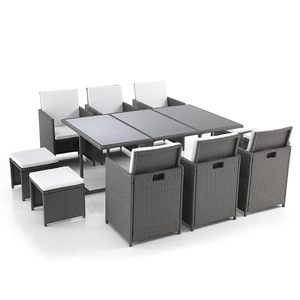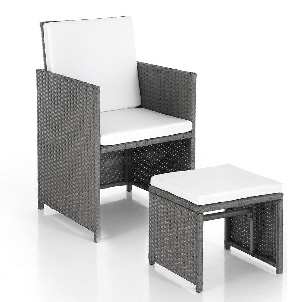 Im Lieferumfang enthalten sind 6 Stühle mit verstellbarer Rückenlehne und 4 Hocker mit Stahlkonstruktionen, die mit grauer Polyrattanschnur bezogen sind, und Kissen, die mit ecrufarbenem, wasserabweisendem Stoff mit abnehmbaren Bezügen bezogen sind.