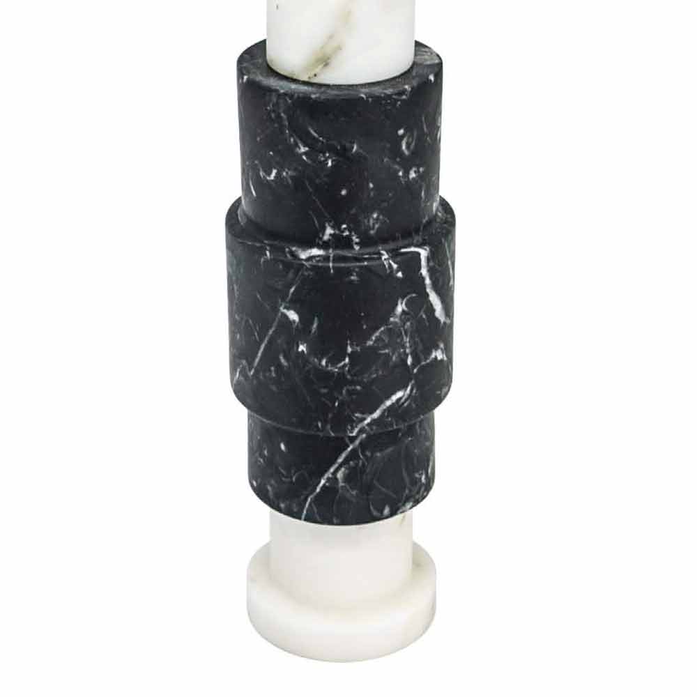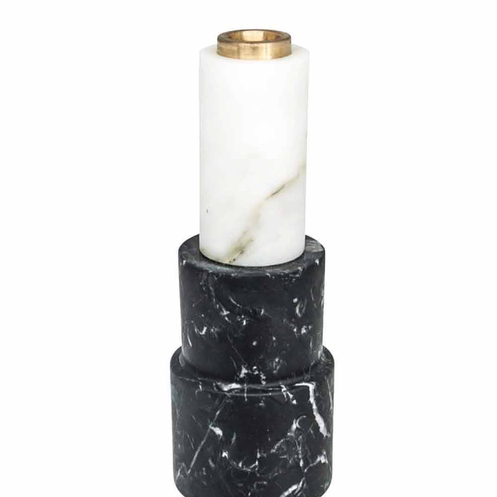 Kerzenhalter aus hochwertigem Marmor und Messing . Es ist als Unikat zu betrachten, da sich jeder verwendete Marmorblock von den anderen für Adern und Schattierungen unterscheidet. Der weiße Marmor stammt aus dem Steinbruch Poggio Silvestre, einer Quelle von Marmor erster Qualität, der seit dem letzten Jahrhundert klassifiziert wurde, während der schwarze Marquinia-Marmor aus spanischen Steinbrüchen gewonnen wird.