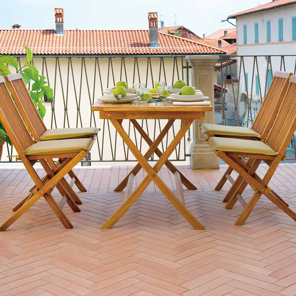 Teakholz gilt als das wertvollste Holz für Gartenmöbel. Es ist extrem langlebig, stabil, widerstandsfähig gegen Witterungseinflüsse, Pilze, Parasiten- und Insektenbefall. Es enthält einen hohen Anteil natürlicher Öle, die es widerstandsfähig machen und die Feuchtigkeitsaufnahme begrenzen. Mit der Zeit neigen Teakholzmöbel, die Sonne, Regen, Feuchtigkeit usw. ausgesetzt sind, im Allgemeinen dazu, eine silbergraue Farbe anzunehmen: Dies ist auf einen Oberflächenoxidationsprozess zurückzuführen, der das Holz auf natürliche Weise schützt. Dieser Prozess ist rein ästhetisch und schadet weder der Struktur noch der Qualität des Holzes. Das Auftreten von Öl auf der Oberfläche von Teakholzmöbeln ist ein natürlicher Prozess: Das Öl kann in den ersten Monaten mehr oder weniger kontinuierlich austreten, je nach der Umgebung, in der die Möbel aufgestellt werden. Die im Teakholz enthaltenen natürlichen Öle machen es zum besten Holz für Gartenmöbel.