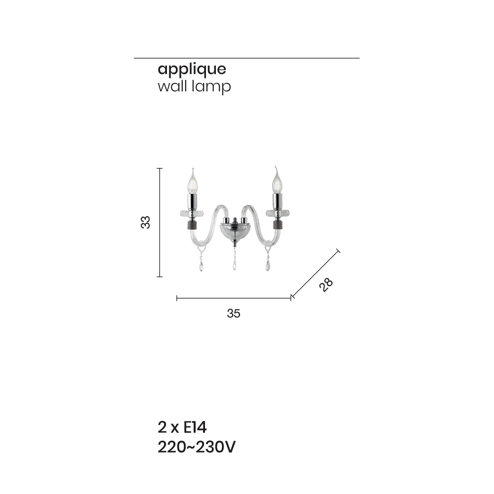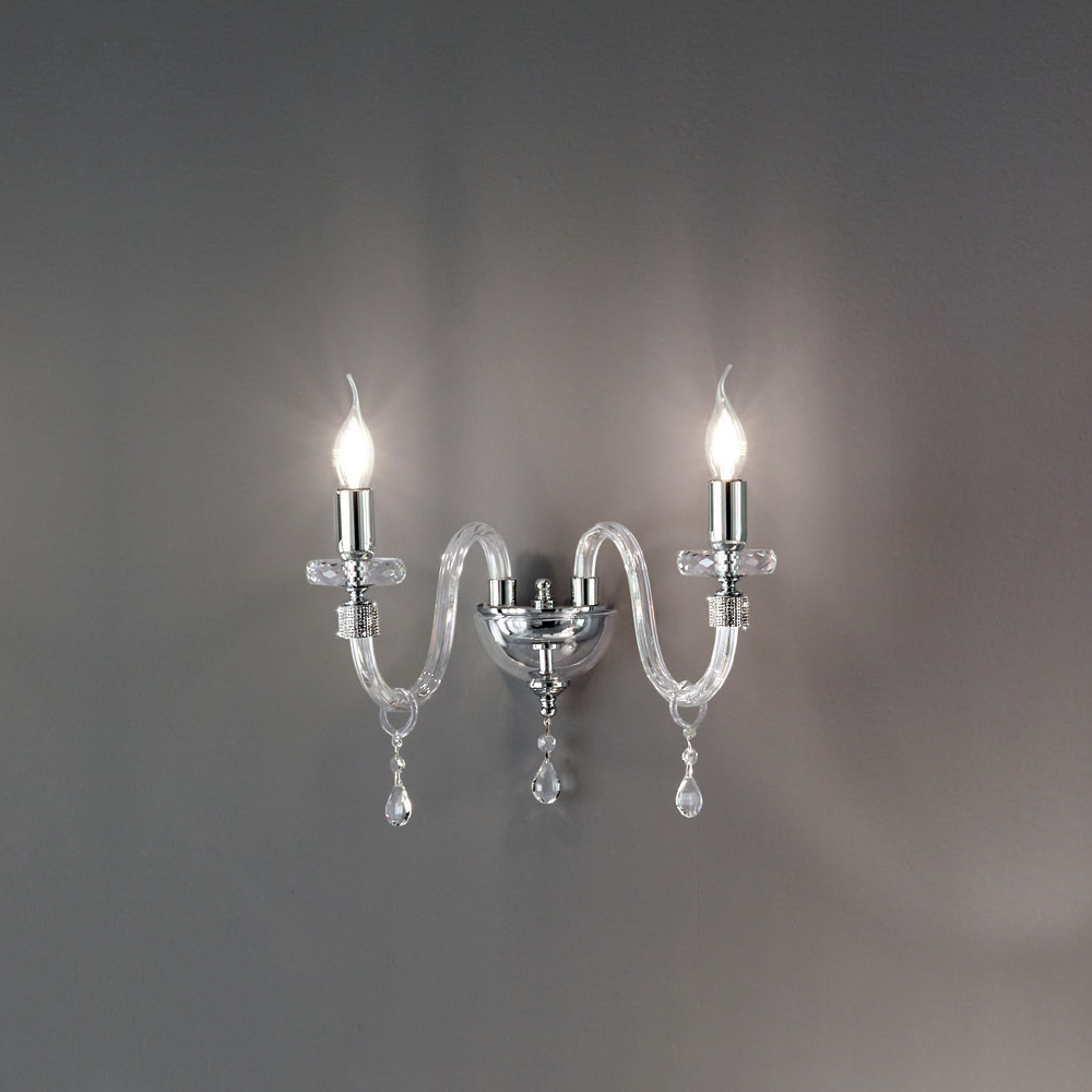 Diese Wandleuchte im klassischen Stil besteht aus 2 bogenförmigen Armen aus transparentem Glas, handgefertigt in Italien mit einem "Rigaton"-Effekt, deren Enden von in das Metall eingelassenem Glitzer umgeben sind, sowie für den zentralen Teil der Ergänzung, wo zwei Röhren kreisförmige Scheiben tragen die Struktur, die von zwei unterschiedlich großen kreisförmigen Scheiben aus geschliffenem Kristall durchsetzt ist.