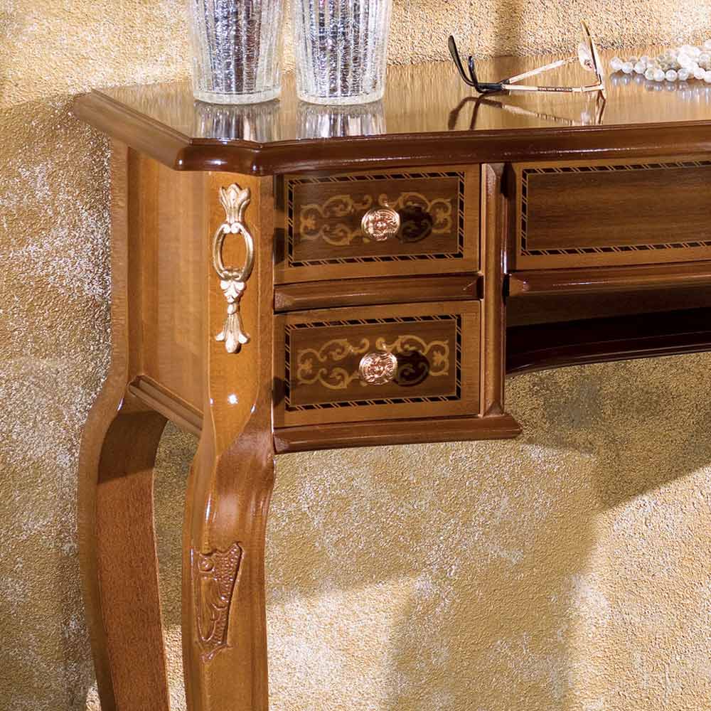Flurkonsole im klassischen Stil mit 5 Schubladen , die vollständig aus Holz gefertigt und in den Ausführungen Nussbaum glänzend oder Weiß und Gold mit Intarsien erhältlich sind. Diese Ergänzung passt mit ihrer Eleganz in jede Umgebung, einzigartig und raffiniert, sie wird vollständig in Italien von erfahrenen Handwerksmeistern hergestellt, vollendet mit Weisheit und Geschmack für Eleganz. Die Produktion erfolgt unter Verwendung hochwertiger Materialien und mit der größten Sorgfalt und Professionalität, die die Produkte Made in Italyauszeichnet .
