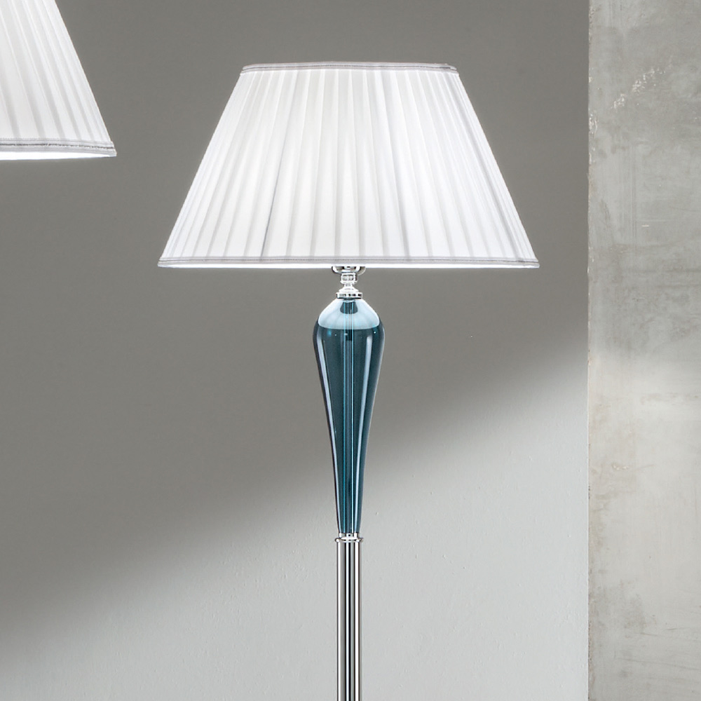 Diese Stehlampe besteht aus einem runden Sockel aus verchromtem Metall , der mit farbigen transparenten Glasmotiven verziert ist.