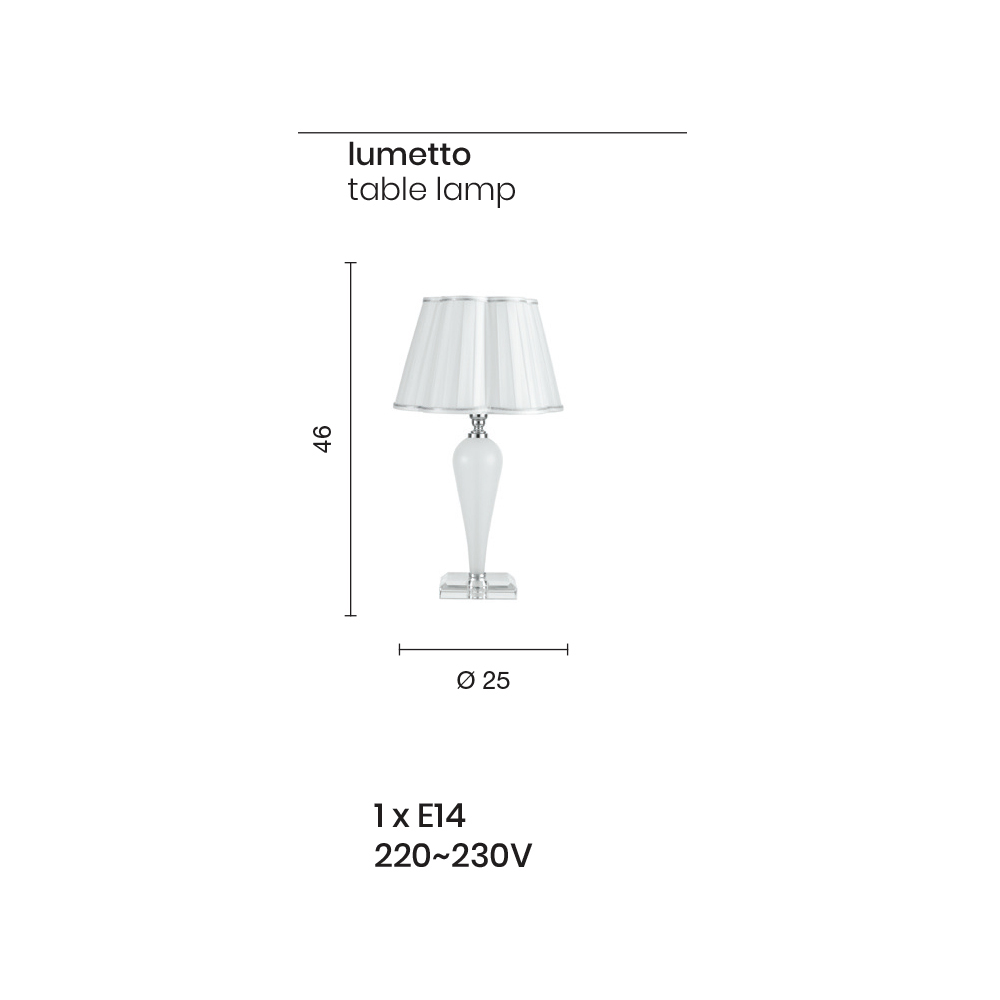 Diese Tischlampe hat ein klassisches, raffiniertes und elegantes Design, bestehend aus einem Sockel aus Kristall und zylinderförmigen Elementen aus handgefertigtem Glas , die die Struktur der Lampe bilden. Die kleinen Details und die Lampenfassungsabdeckung bestehen aus verchromtem oder goldenem Metall ; während der Gänseblümchen-Lampenschirm aus weißem Stoff mit silbernen oder goldenen Oberflächen besteht.