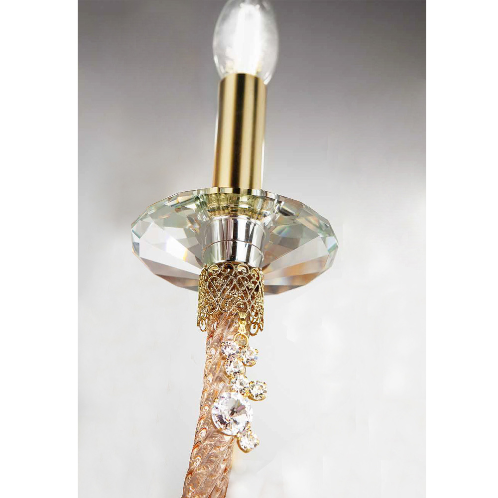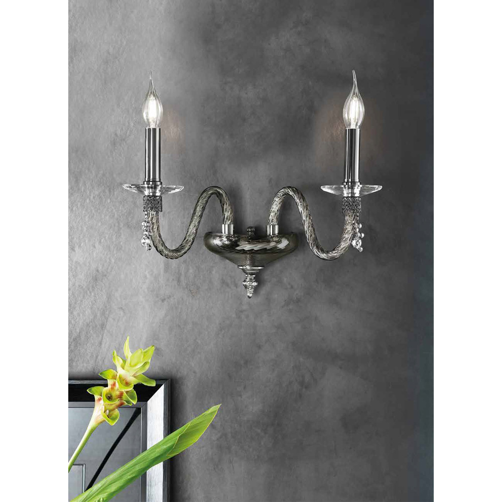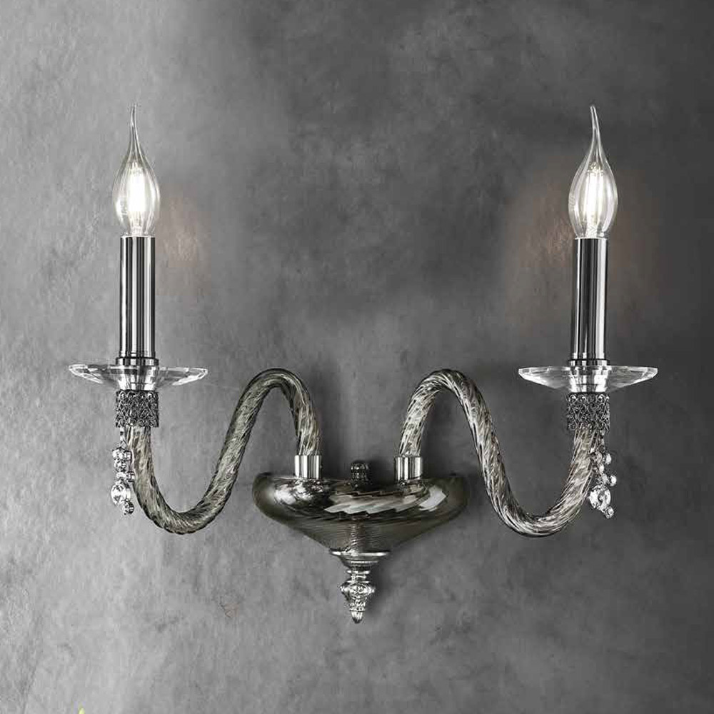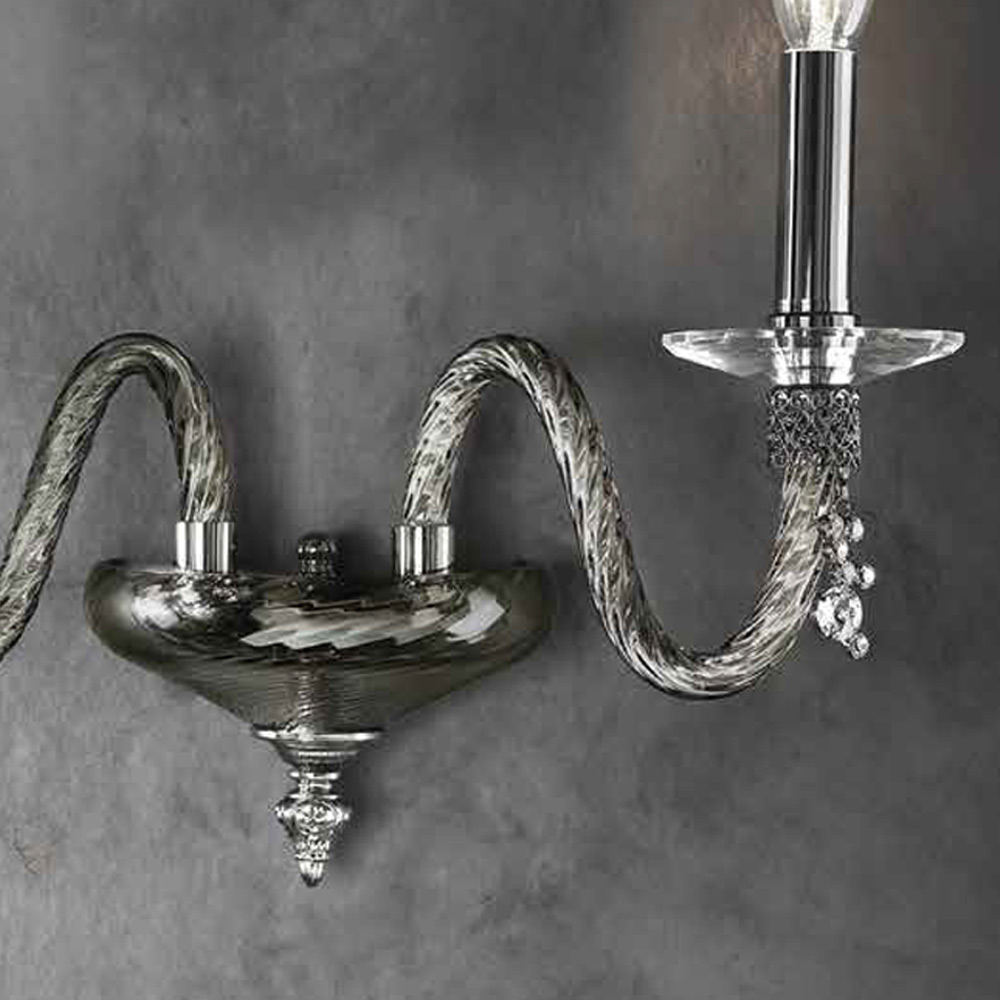 Die 2-flammige Wandleuchte ist ein luxuriöses Beleuchtungszubehör , das vollständig in Italien aus mundgeblasenem Glas höchster Qualität mit Metallic- Finish hergestellt wird. Was es einzigartig und majestätisch macht, sind die ebenfalls handgefertigten Juwelendetails und die handgefertigten filigranen Metallelemente, die einen klassischen Stil vergangener Zeiten zum Leben erwecken, dessen Charme zum Protagonisten im Bestimmungsort wird.