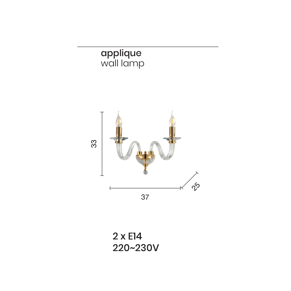 2-Licht-Wandlampe aus handgefertigtem Glas und goldfarbenem Metall, klassischer Luxus made in Italy.