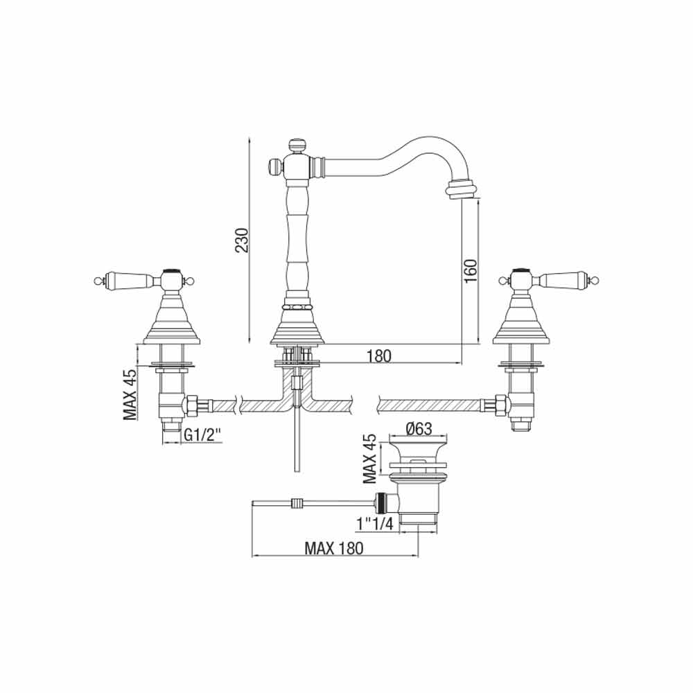 3-Loch-Waschtischmischer aus Messing im klassischen Design Hergestellt in Italien.