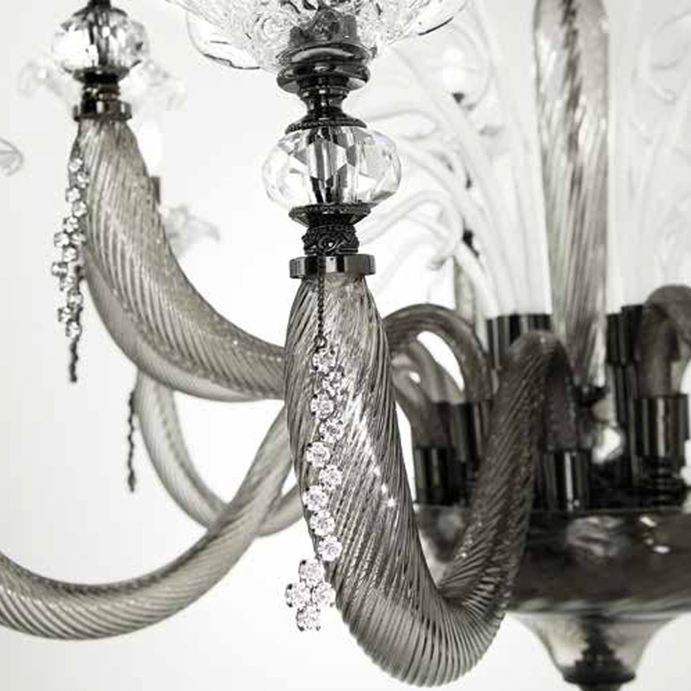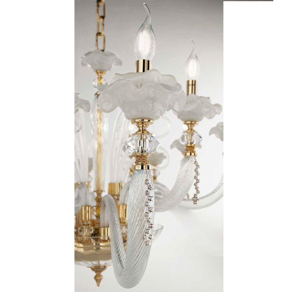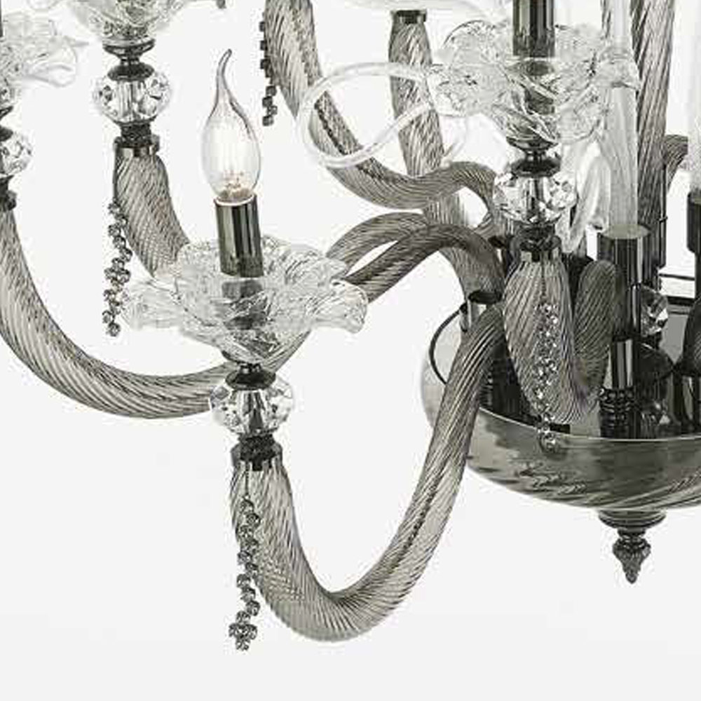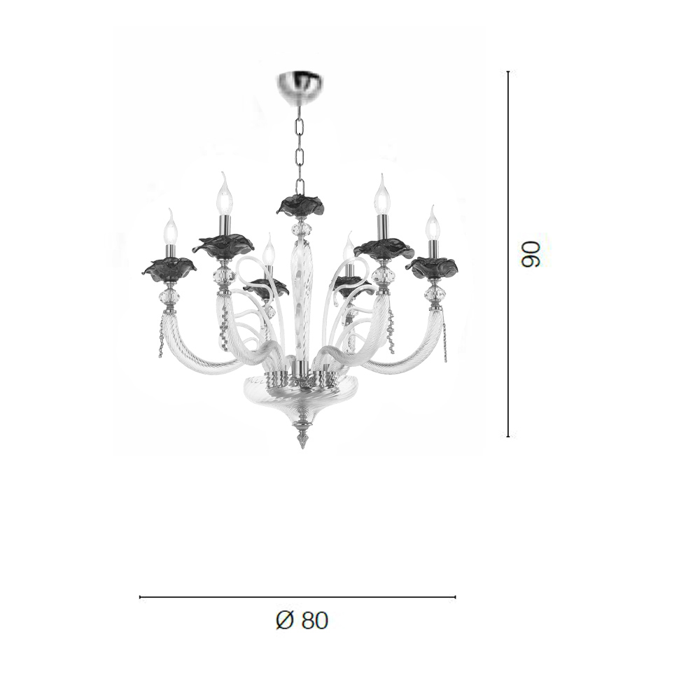 Der 6-flammige Kronleuchter ist ein luxuriöses Beleuchtungszubehör , das vollständig in Italien aus feinstem mundgeblasenem Glas von höchster Qualität mit floralen Details aus Glas hergestellt wird.