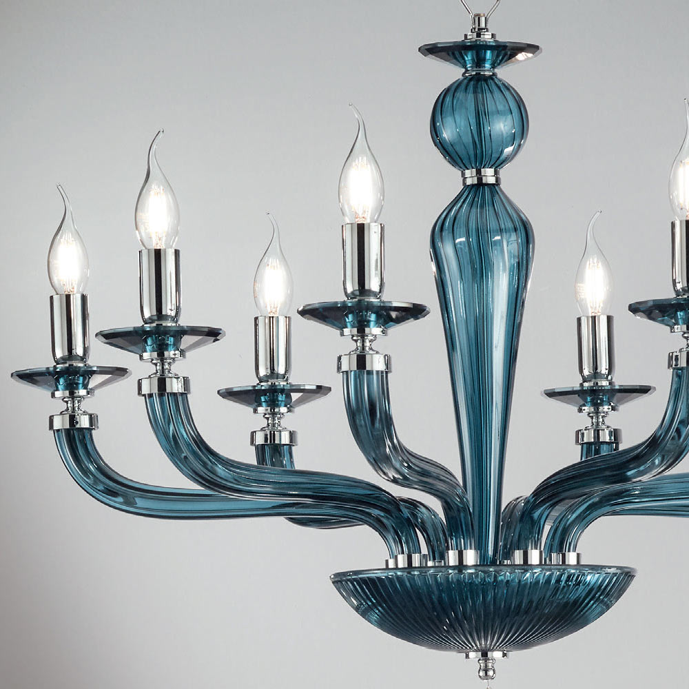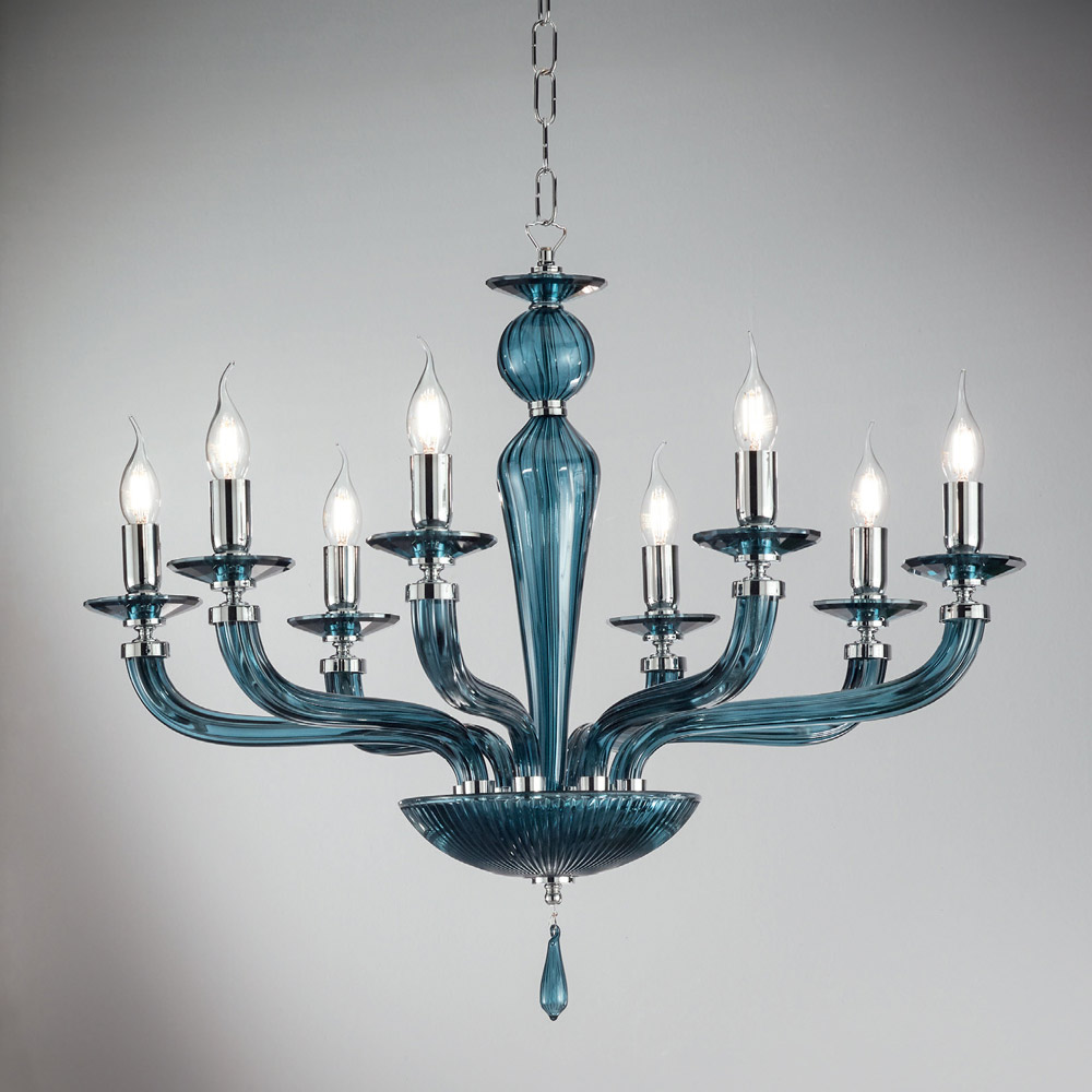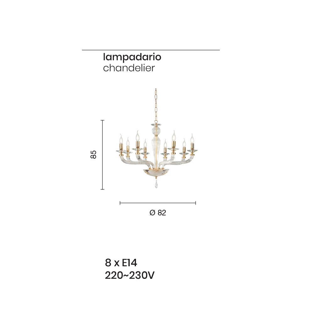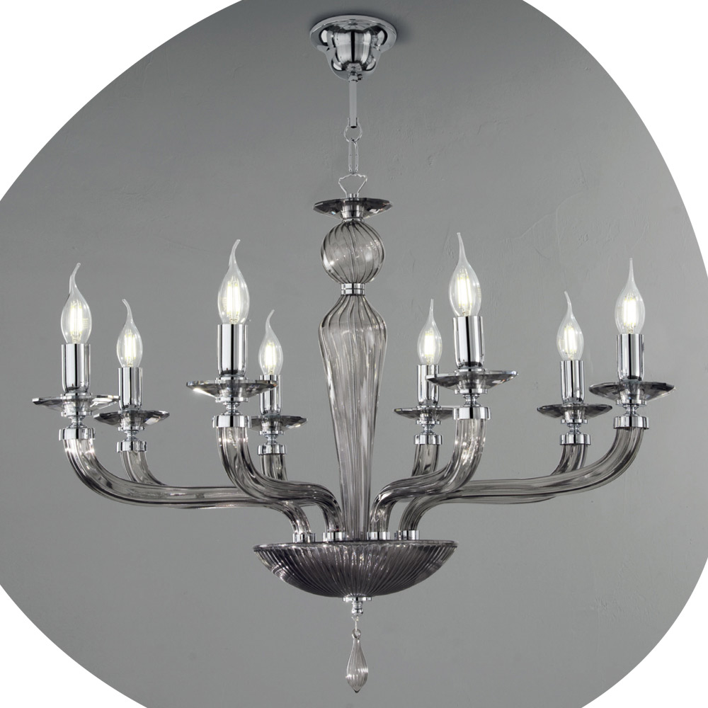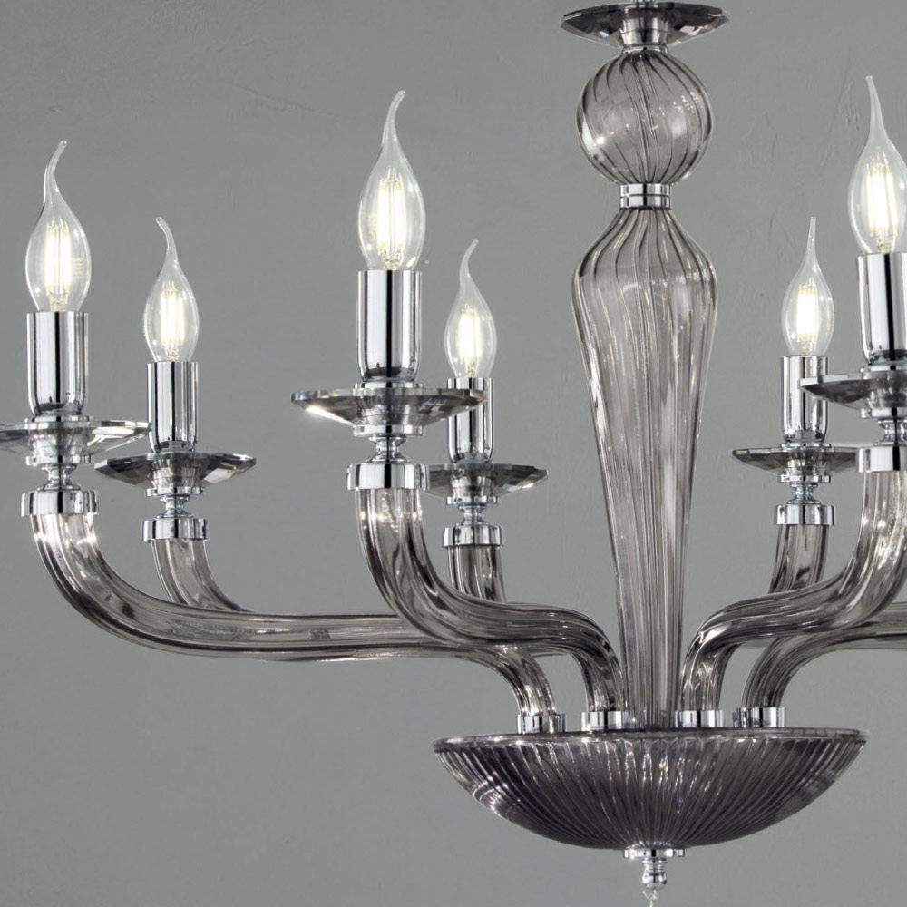 Dieser Hängeleuchter im klassischen Stil besteht aus 8 gebogenen Armen aus handgefertigtem Glas in Italien mit „Rigaton“-Effekt in Bernsteinoptik, die die Untertassen mit den Lichtquellen tragen.
