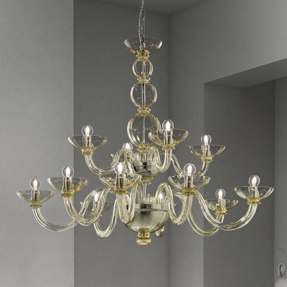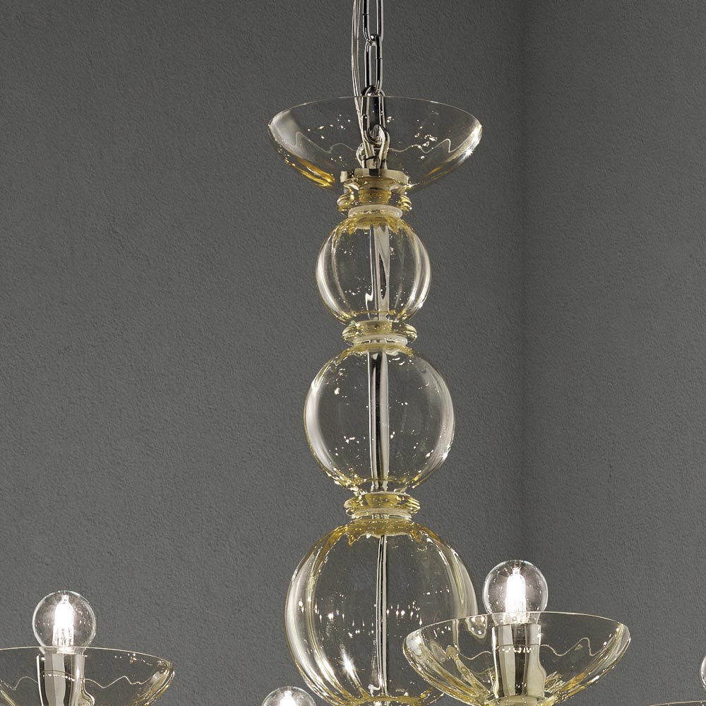 Kronleuchter mit 12 Lichtern aus venezianischem Glas, handbearbeitetes Topas-Finish mit Details aus poliertem, verchromtem Metall . Ein Möbelstück mit einer erstaunlichen und ikonischen Präsenz, das sich durch eine weiche und zarte Linie und raffinierte Rundungen auszeichnet, die sich perfekt an klassische Umgebungen, aber gleichzeitig auch an Räume mit zeitgenössischem Stil anpassen. Das Element der Tradition wird durch seine wunderbaren Komponenten aus vollständig von Hand gefertigtem mundgeblasenem Glas unterstrichen, das sich dank trendiger Farben verwandelt, um sich selbst zu aktualisieren. Seine umhüllenden Formen machen es zu einem idealen Element, um jede Wohn- und Objektumgebung mit Klasse und Dynamik zu besetzen.