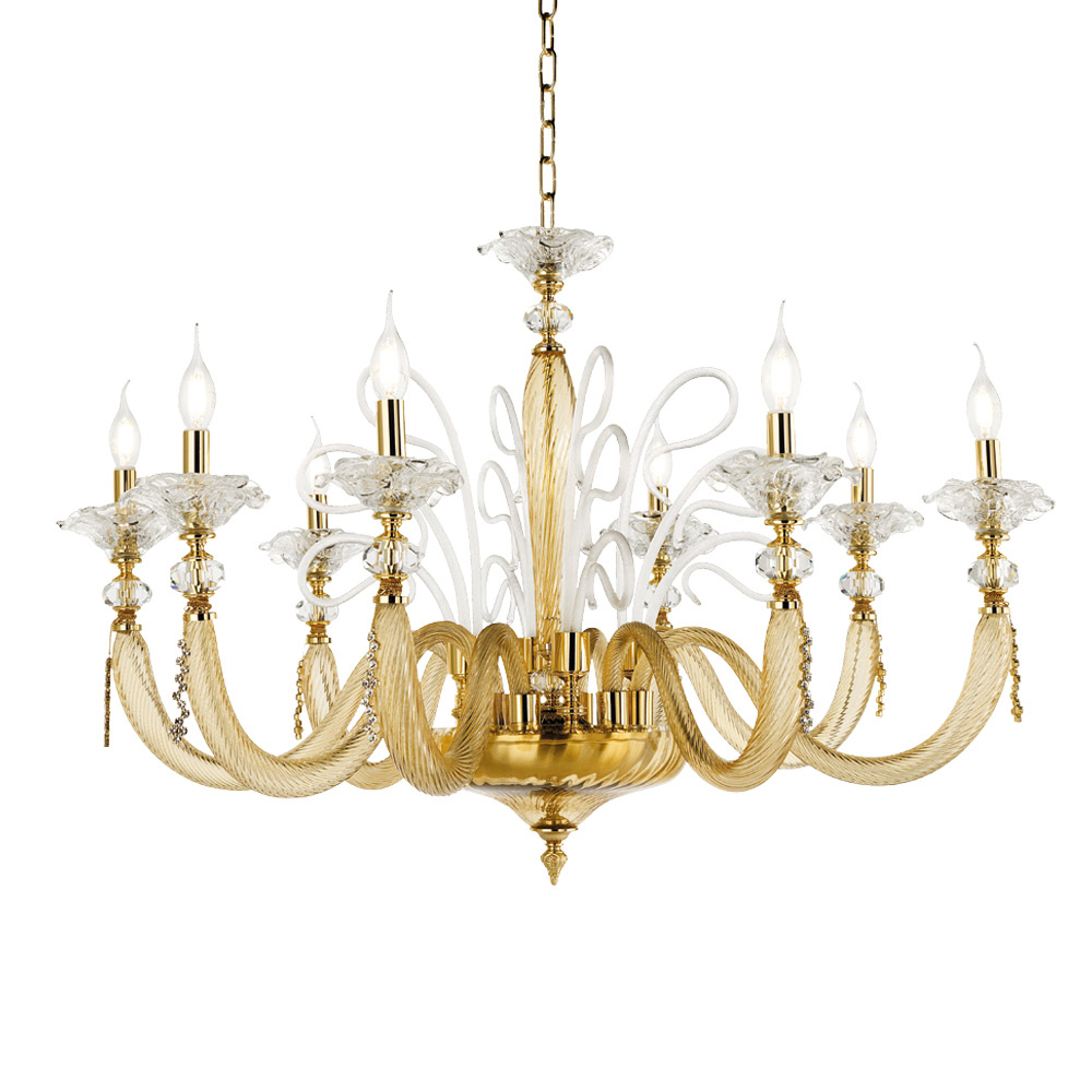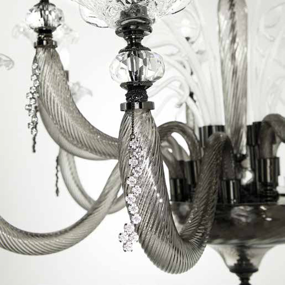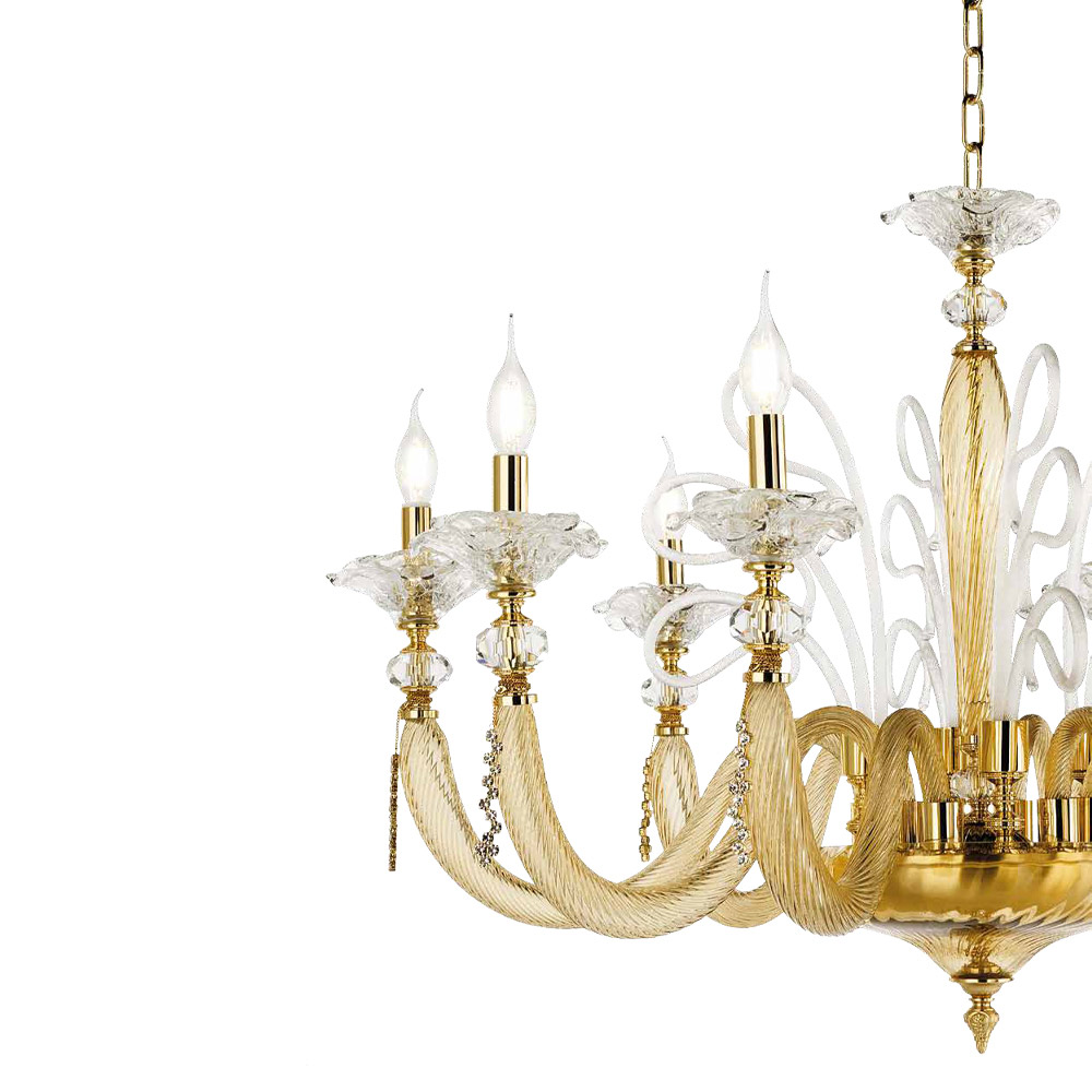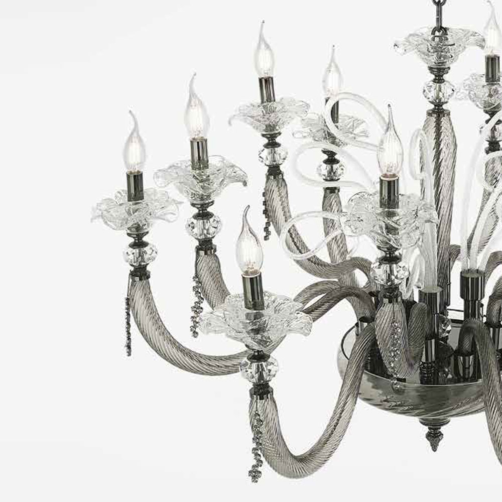 Handgefertigter Kronleuchter mit 8 Lichtern aus mundgeblasenem Glas und Blumendekorationen, italienischer Luxus.