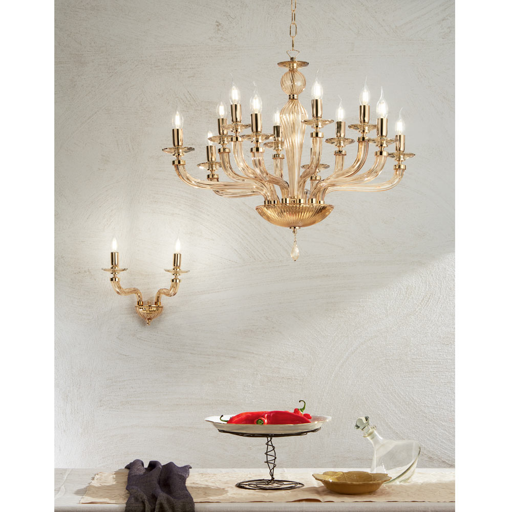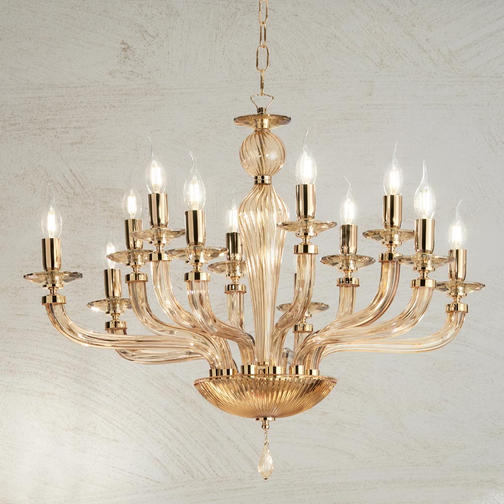 Dieser Hängeleuchter im klassischen Stil besteht aus 12 gebogenen Armen aus handgefertigtem Glas in Italien mit „Rigaton“-Effekt in Bernsteinoptik, die die Untertassen tragen, auf denen sich die Lichtquellen befinden.