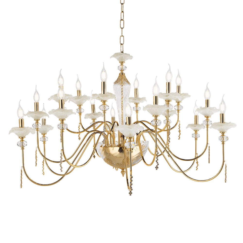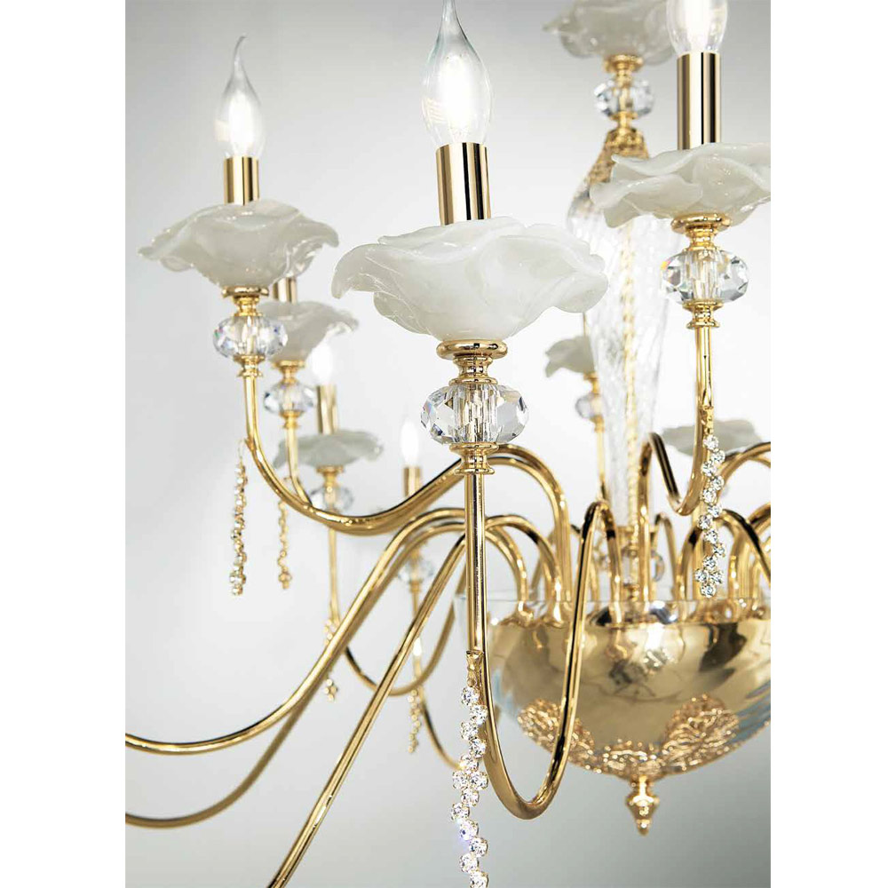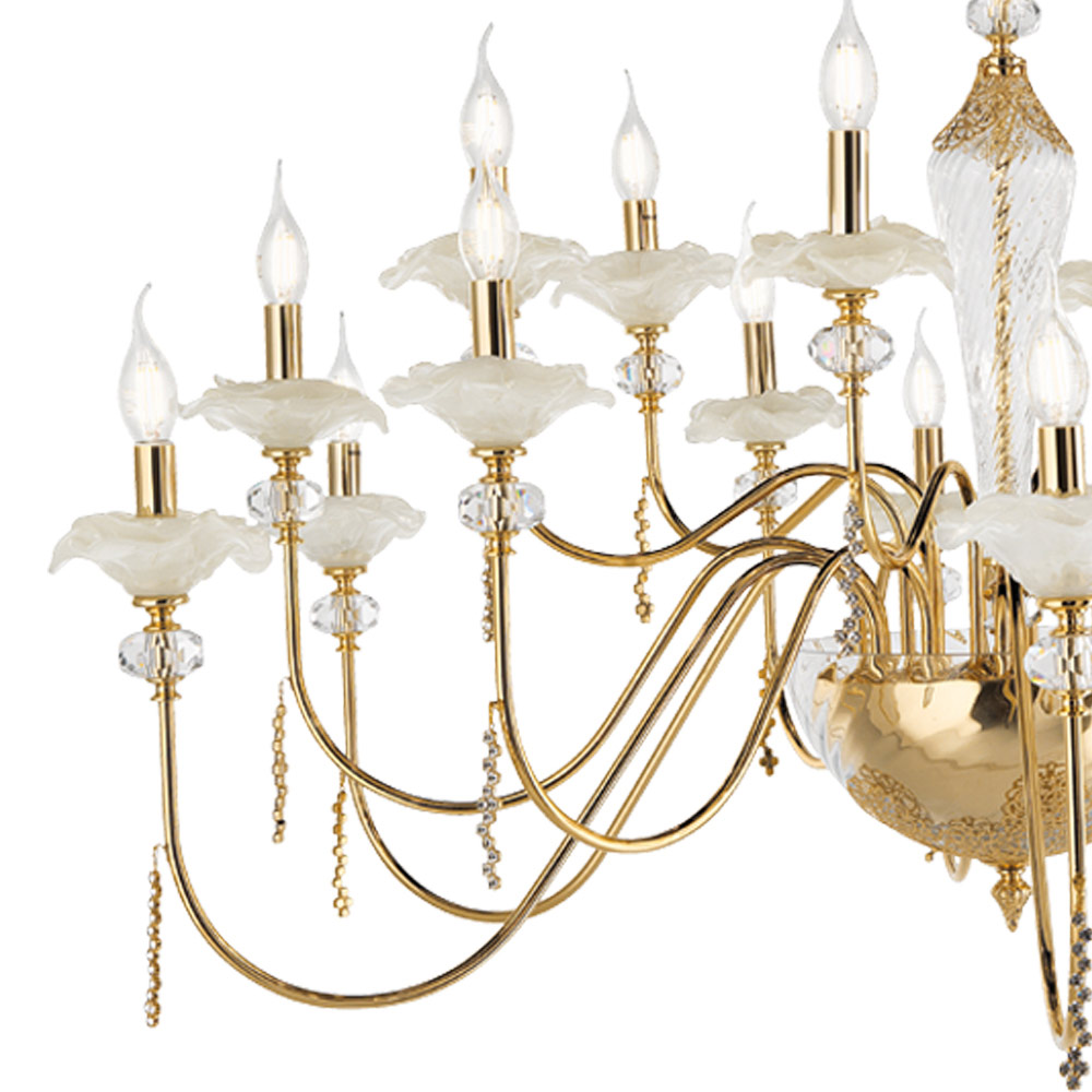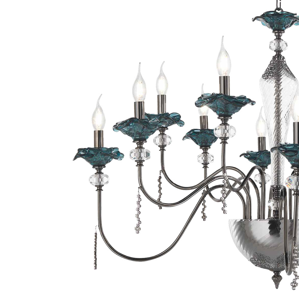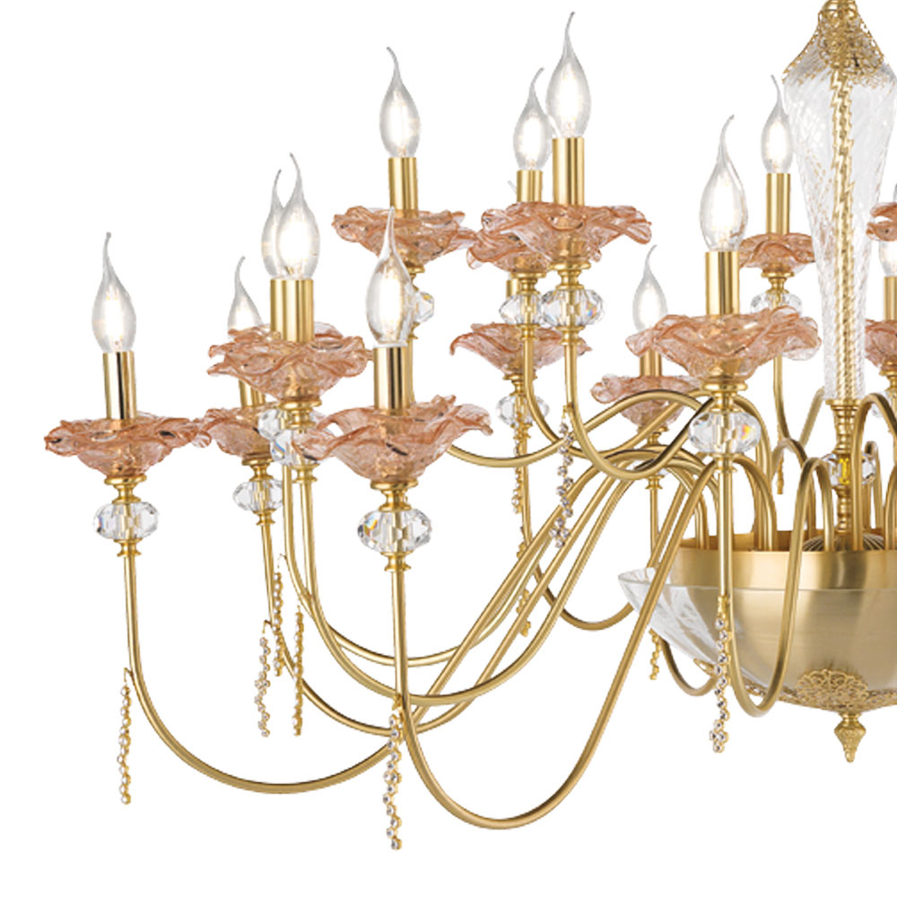 Kronleuchter mit 18 Lichtern aus handgefertigtem Glas mit Knospen und Kristalltropfen, Luxus made in Italy.