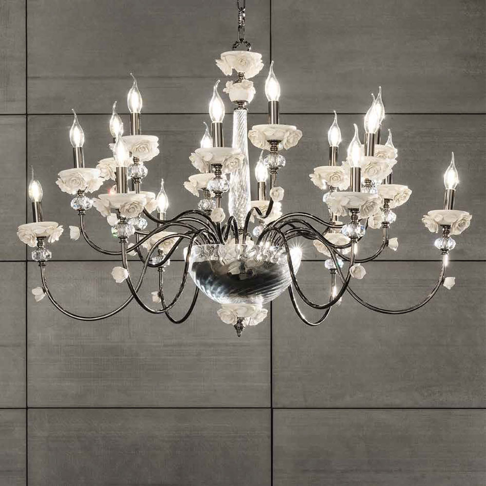 Kronleuchter mit 18 Lichtern aus Porzellan und mundgeblasenem Glas, Luxus made in Italy.