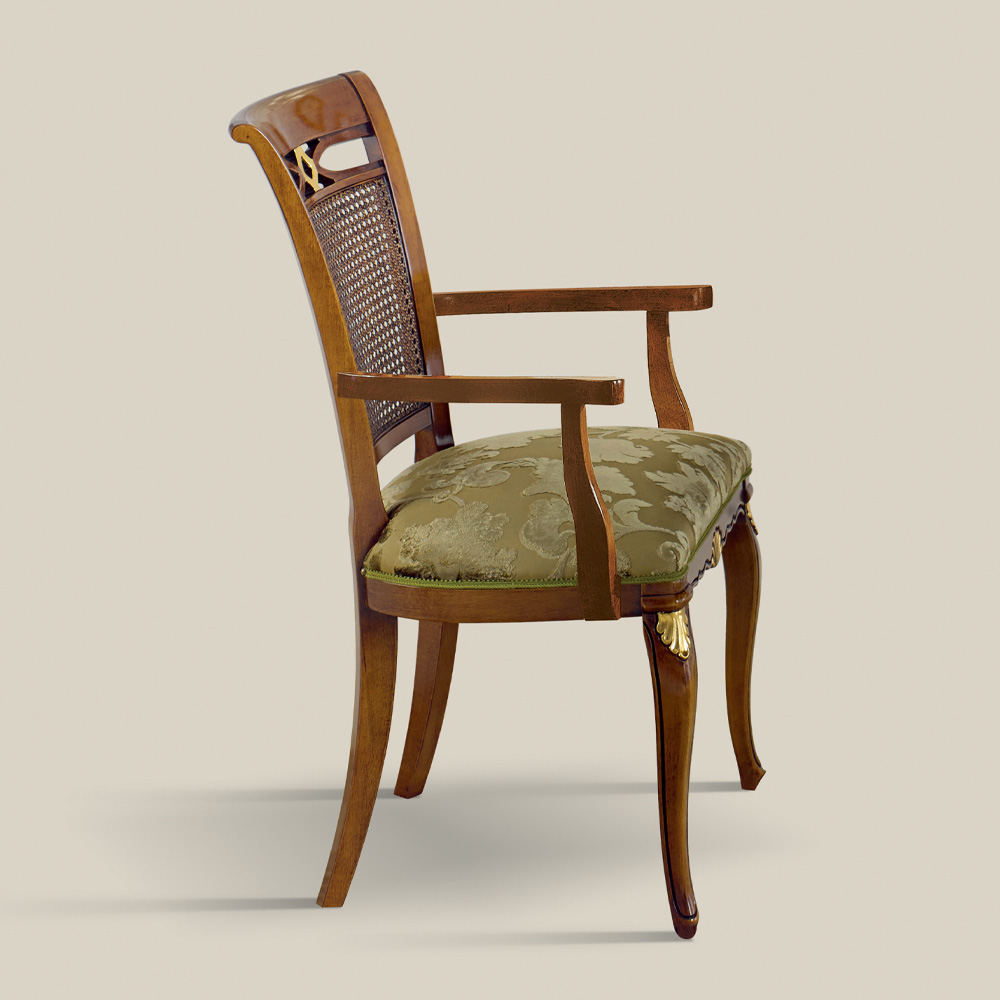 Esszimmerstuhl im zeitlos klassischen Stil , perfekt um jeden Wohnbereich mit Persönlichkeit und Eleganz zu dekorieren . Dieser Stuhl hat eine Struktur aus Holz mit Bassano-Nussbaum und Antikgold-Finish und eine Sitzfläche mit gepolsterter Sitzfläche, die mit Stoff bezogen ist, mit einer Rückenlehne aus Wienerstroh . Außerdem kann zwischen der Version mit oder ohne Armlehnen gewählt werden.