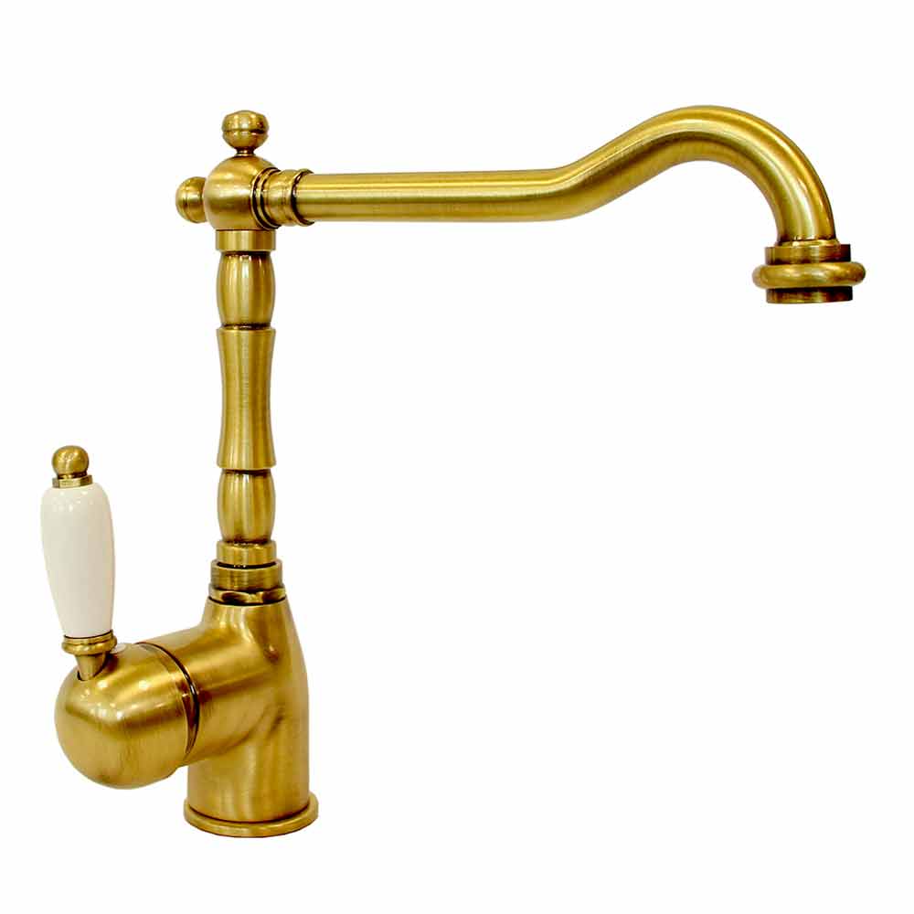 Küchenspüle Mischer in Italien in Messing komplett mit einstellbarem antikem Ausguss gemacht. Dieser Artikel zeichnet sich durch ein besonderes Augenmerk auf die Umwelt aus und schlägt eine Patrone mit definierter ES vor , die genau auf Energieeinsparung ausgelegt und konzipiert ist, da sie kaltes Wasser liefert, wenn der Hebel in der Mittelstellung angehoben wird, wodurch die Anforderung von heißem Wasser an den Kessel vermieden wird und a konsequente Energieeinsparung. Sein Design zeichnet sich durch Linien mit klassischem Geschmack aus, die die Eleganz von Messing und seine wundervollen Oberflächen treffen und ein raffiniertes Objekt schaffen, das die Einrichtung jeder Küche revolutionieren kann und eine raffinierte und edle Note verleiht, die perfekt für Umgebungen mit einem sehr traditionellen Charakter geeignet ist modern und zeitgemäß.