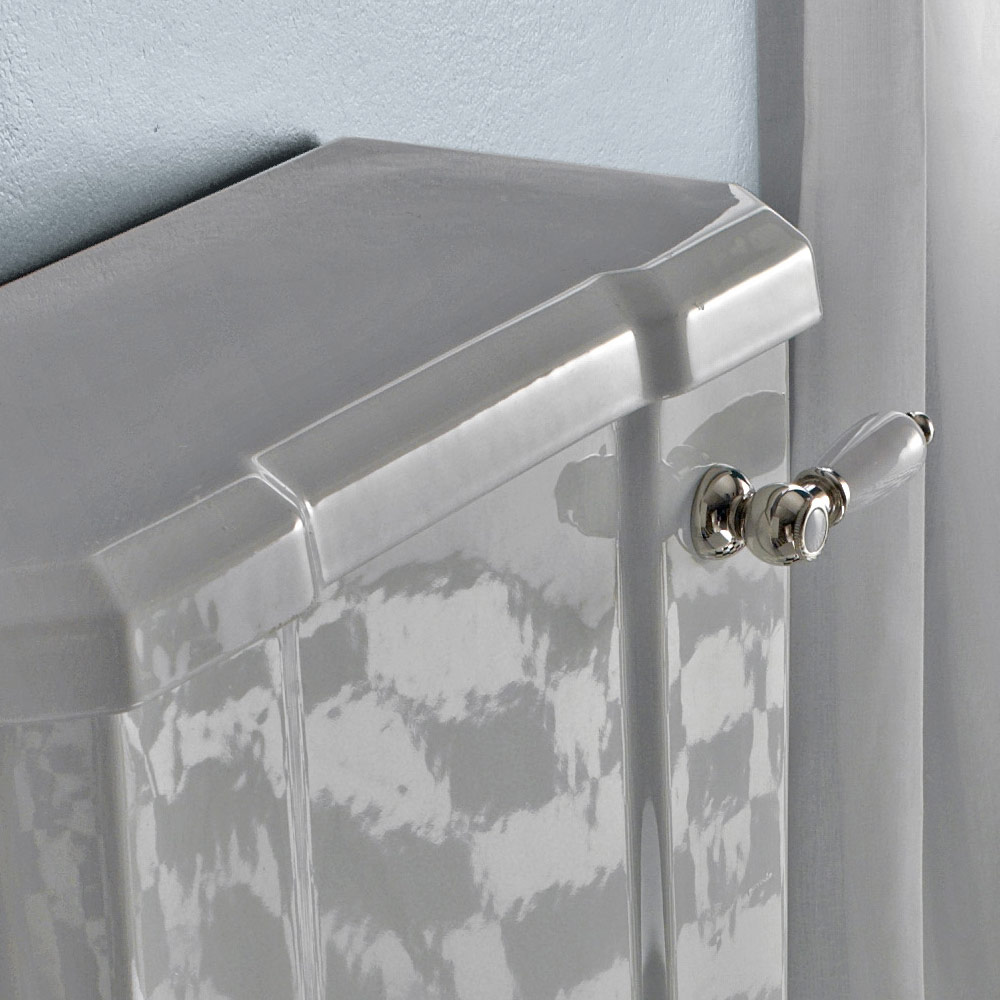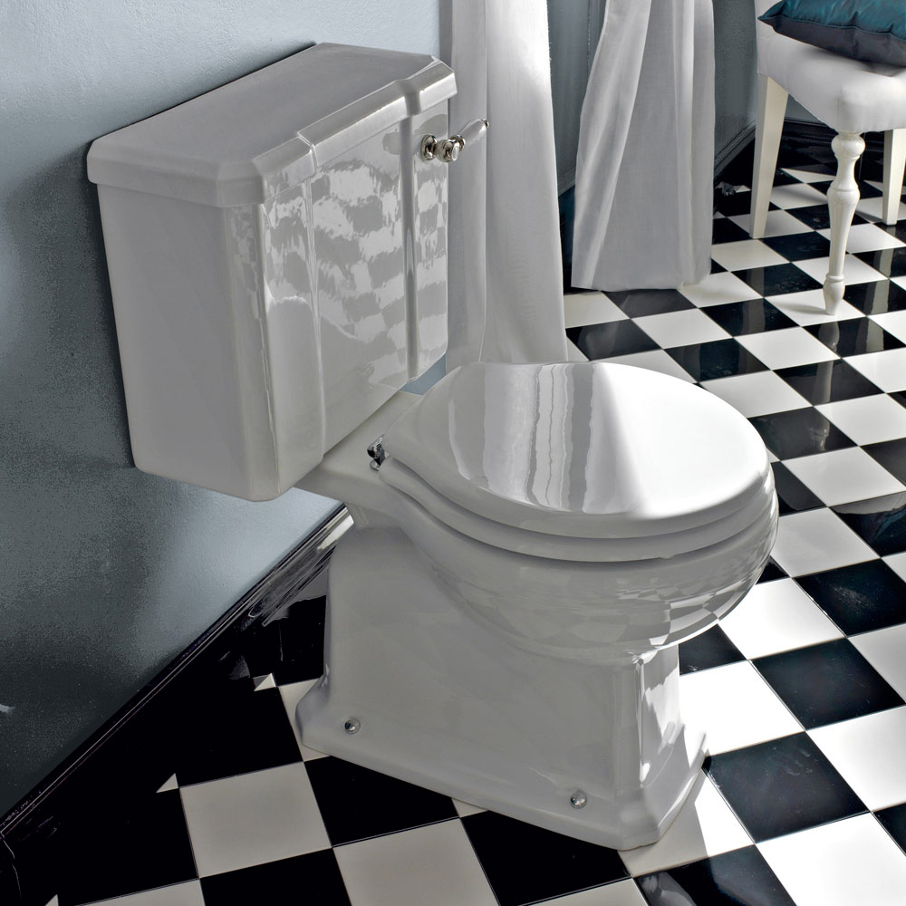 Marwa ist eine stattliche Monoblockvase mit tropfendem Rand und Bodenablauf . Moderne und Tradition merge mit der Verwendung des weißen Sitzes mit Chrom Scharnieren und dem Monoblock - Kasten mit Loch für die Drain - Batterie mit vorderen Hebeln in weißer Keramik und vernickelt.