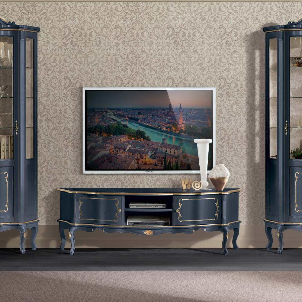 TV-Ständer im klassischen Stil mit 2 Türen und 2 Fächern aus Holz, entworfen, um den Wohnbereich mit Persönlichkeit und Geschmack einzurichten, auch dank der wunderbaren verfügbaren Oberflächen. Ein einzigartiges und raffiniertes Accessoire, vollständig in Italien von erfahrenen Handwerksmeistern hergestellt, Meistern der Kunst, die jedes Stück mit Geschick und Sinn für Eleganz fertigstellen. Die Produktion erfolgt aus hochwertigen Materialien und die Verarbeitung erfolgt vonHand mit größter Sorgfalt und Professionalität, die Made in Italy -Produkte auszeichnet.