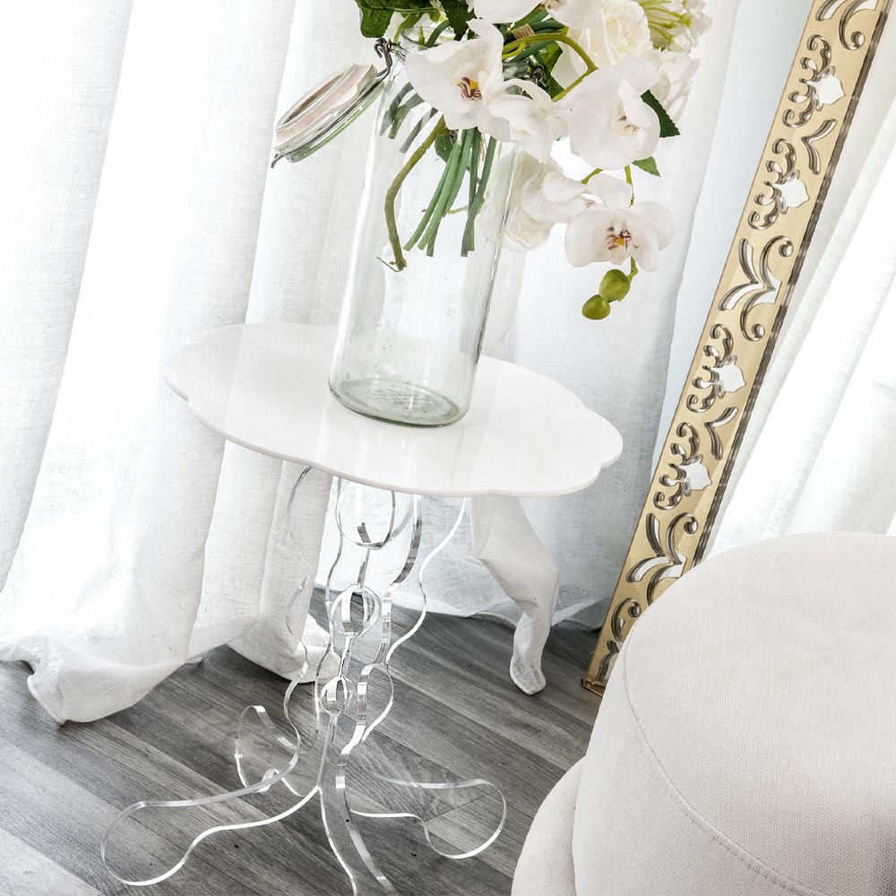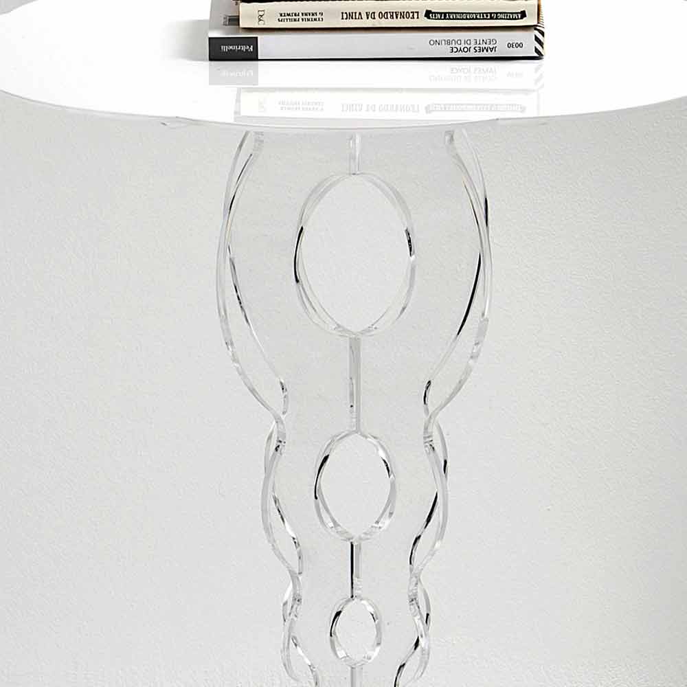 Kleiner runder Tisch weiß Durchmesser 50cm modernes Design Janis, made in Italy Maurische Referenzen für den weißen Kaffeetisch von Janis: Die 100% PMMA Plexiglasbasis aus transparentem Polymer, lasergeschnitten, gibt Diskretion, während das weiße Regal mit vollem Pigment der häuslichen Umgebung einen Hauch von Farbe verleiht. Plexiglas ist stoßfest, nicht verformbar, unveränderbar und wärmeisolierend. Die Helligkeit und Helligkeit werden über die Zeit konstant und unverändert beibehalten. PMMA Plexiglas aus reinem Polymer ist ungiftig, hypoallergen, geruchlos und antibakteriell. Entworfen, entworfen und hergestellt in Italien, mit italienischen Materialien.