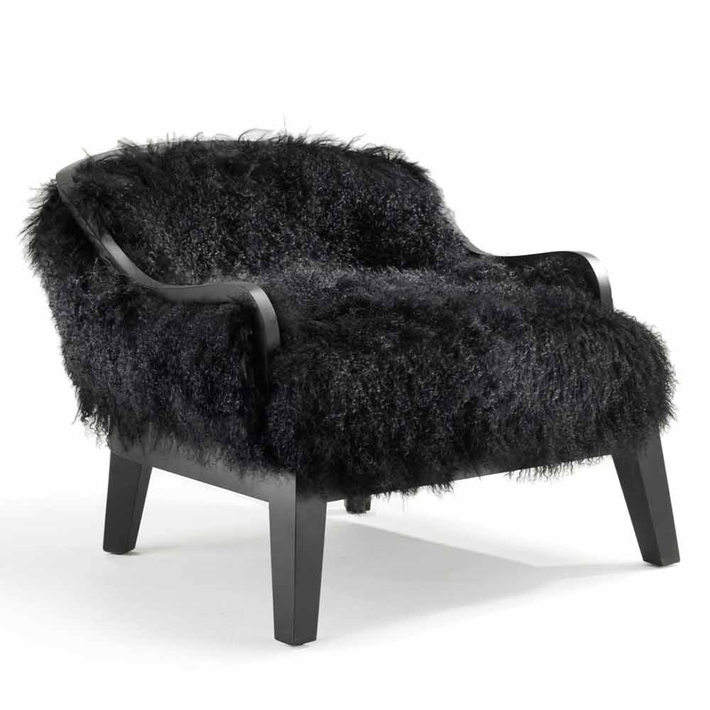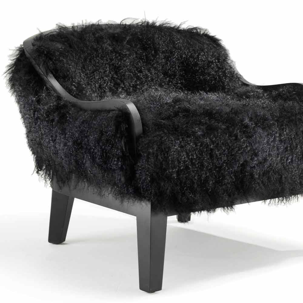 Niedriger Sessel. Retro Rücken mit Leder bezogen. Vordersitz und Rücken mit schwarzem Tibet-Lammhaar bedeckt. Holzrahmen und Sockel. Finish in schwarzer Eiche.