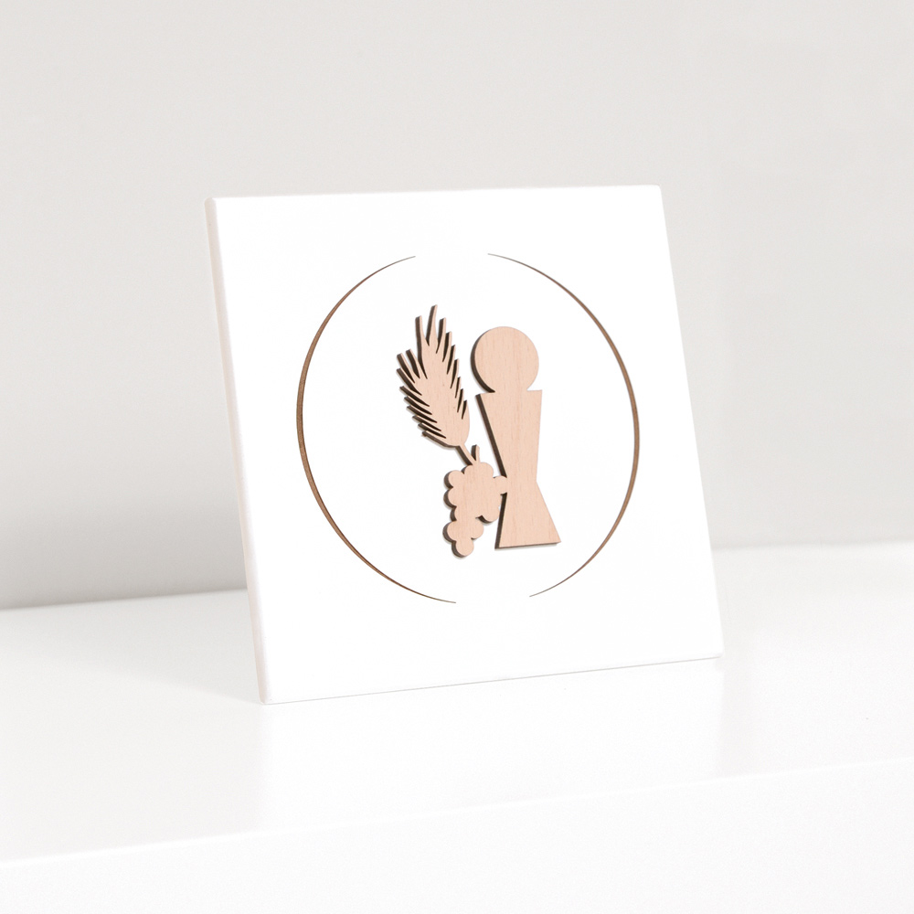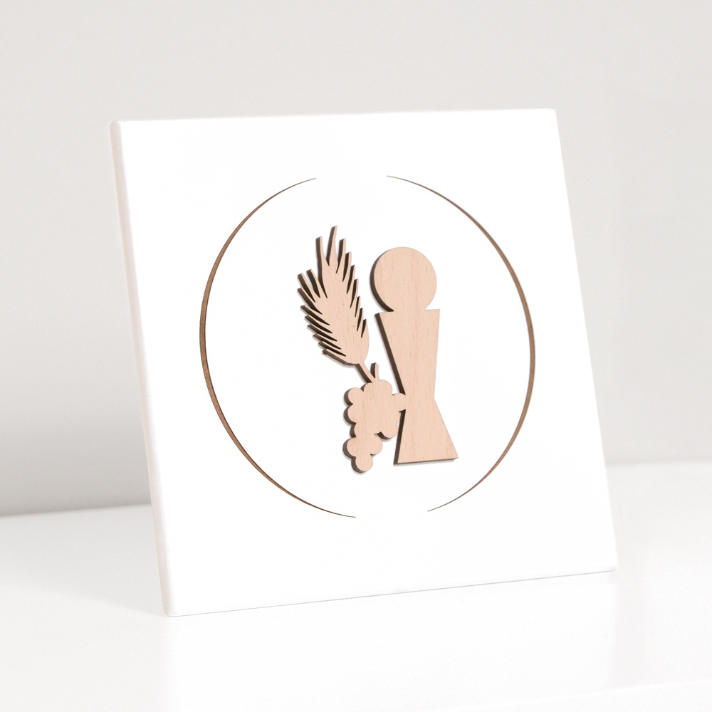 Heiliges Bild mit Kommunionkelch, Ähre und Weintrauben aus Naturholz, appliziert und lasergraviert. Weiß lackierte Holzplatte mit Stützfuß und Loch zum Aufhängen an der Wand.