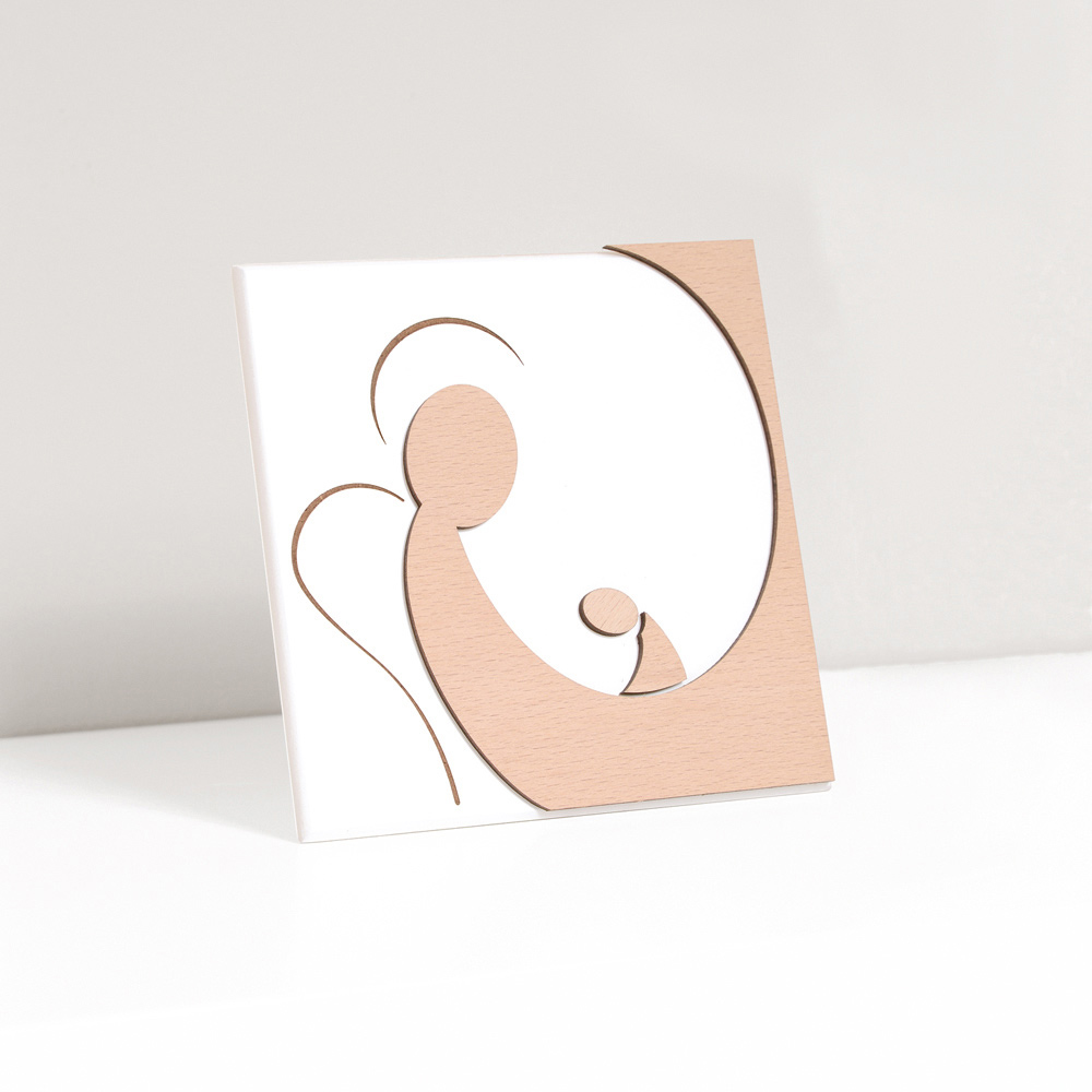 Heiliges Bild mit Mutter und Kind aus Naturholz . Weiß lackierte Holzplatte mit Stützfuß und Loch zum Aufhängen an der Wand.