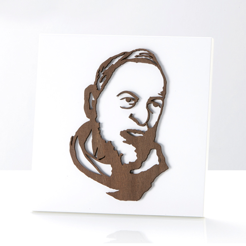 Heiligenbild mit Padre Pio aus Wengeholz . Weiß lackierte Holzplatte mit Stützfuß und Loch zum Aufhängen an der Wand.