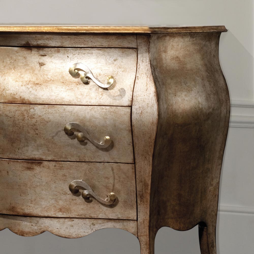 Kommode aus Linden-Tischlerplatte mit handgefertigtem Blattfinish, bestehend aus 3 Schubladen mit Griffen aus Mekka-Silberblatt. Die in der Branche erfahrenen italienischen Handwerker haben bei der Gestaltung jedes einzelnen Details und bei der Auswahl der Materialien größte Sorgfalt und Aufmerksamkeit walten lassen, um die Qualität eines in Italien hergestellten Produkts zu gewährleisten. Die weichen, geschwungenen Linien und die edlen Oberflächen erwecken ein Element zum Leben, das die Umgebung vervollständigen und personalisieren kann und dem Kunden große Kapazität und Funktionalität bietet.