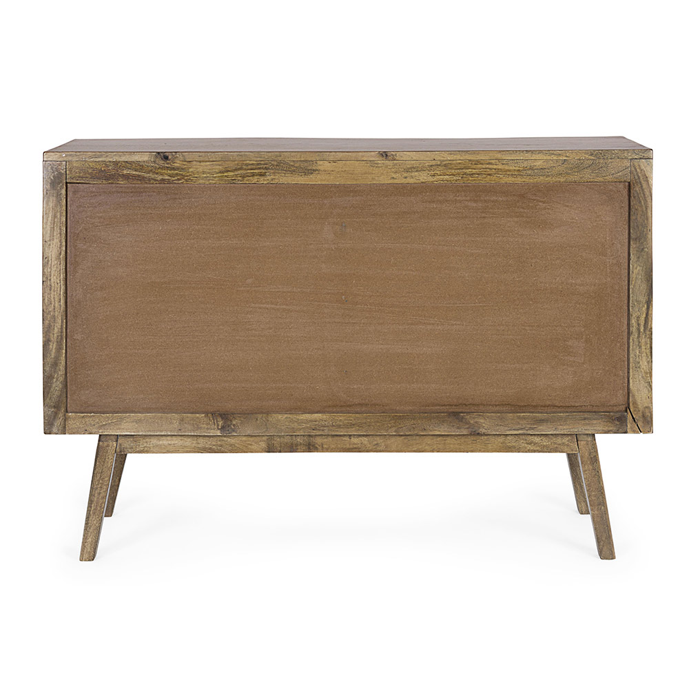 Diese Designer-Kommode für das Wohnzimmer hat eine Struktur und Beine aus Mangoholz mit wasserbasierter Oberfläche und eine Rückseite aus MDF. Die Knöpfe sind aus Stahl und die Beine sind zu montieren. Das Ergebnis ist ein elegantes Stück im Vintage-Stil.