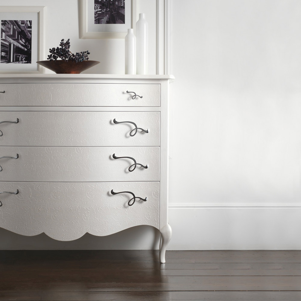 Kommode aus Linden-Tischlerplatte mit handwerklicher Perlmutt-Oberfläche, bestehend aus 4 Schubladen mit verchromten Griffen. Erfahrene italienische Handwerker haben sich um jedes Detail gekümmert und die Materialien ausgewählt, um die Qualität von Made in Italy zu gewährleisten. Weiche, geschwungene Linien und feine Oberflächen schaffen Elemente, die die Umgebung vervollständigen und ihr eine einzigartige Note verleihen und den Kunden große Kapazität und Funktionalität bieten.