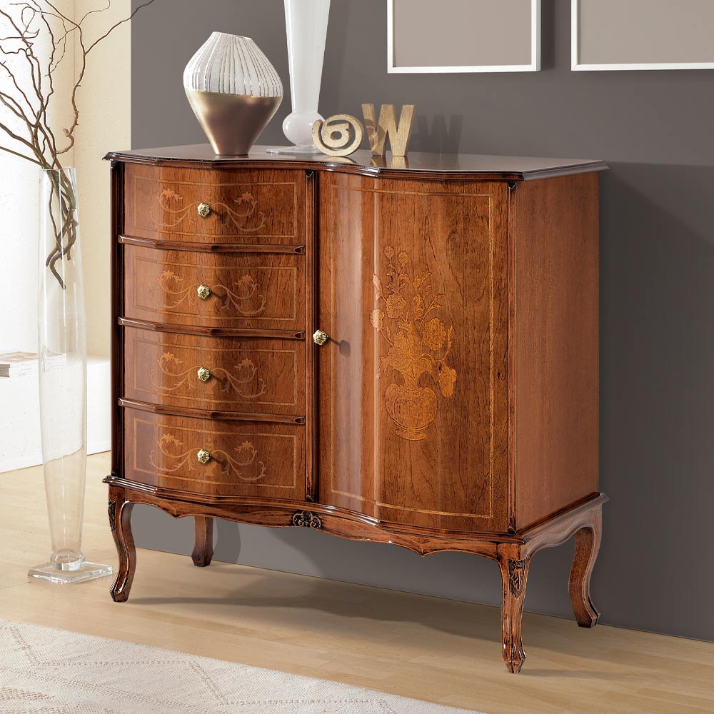 Kommode mit einer Tür und vier Schubladen im klassischen und eleganten Stil .Hergestellt aus wertvollem poliertem Walnussholzmitgoldenen Einlagen , die es zu einer raffinierten Ergänzung machen, die in der Lage ist, die Umgebung, in der es platziert wird, zu verschönern. Vollständig in Italien hergestellt und von erfahrenen Handwerksmeistern handgefertigt, vollendet mit Weisheit und Geschmack für Eleganz. Die Produktion erfolgt unter Verwendung hochwertiger Materialien und mit der größten Sorgfalt und Professionalität, die die Produkte Made in Italyauszeichnet .