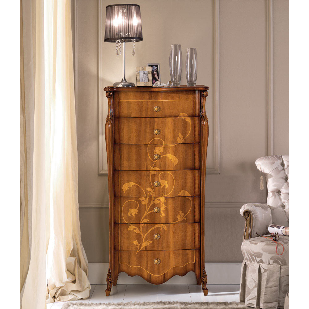 Kommode mit 7 Schubladen aus Walnussholz mit Intarsien Made in Italy.
